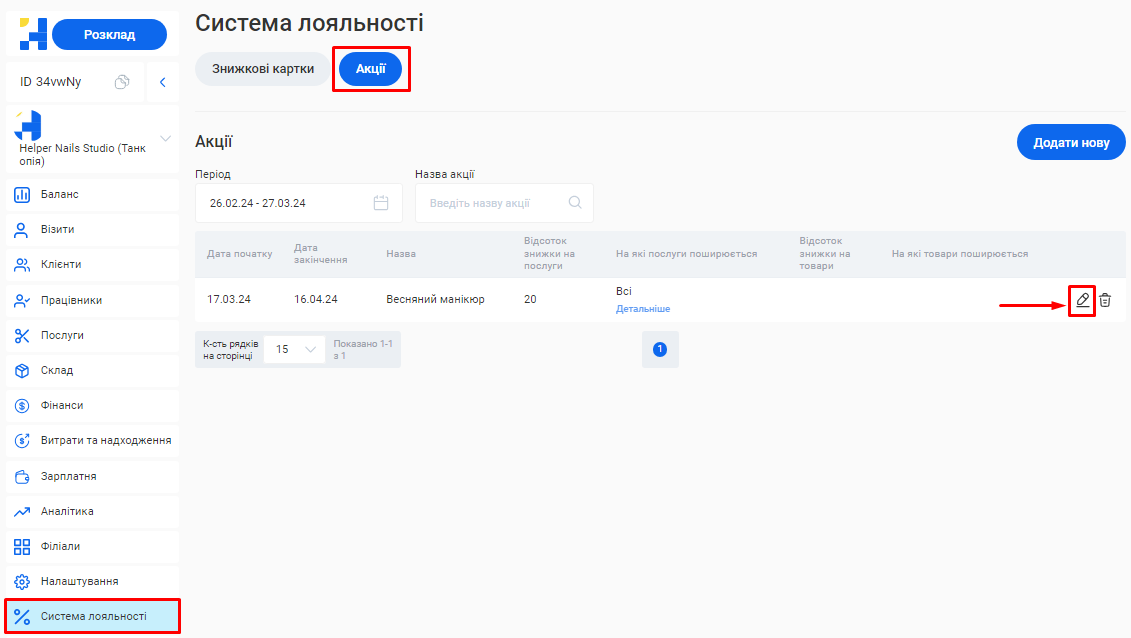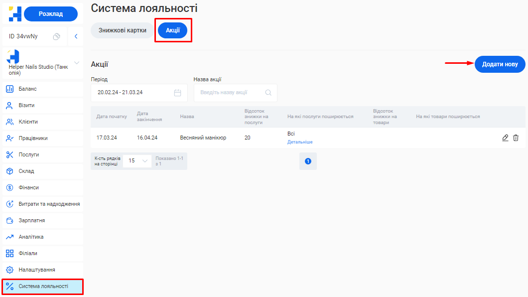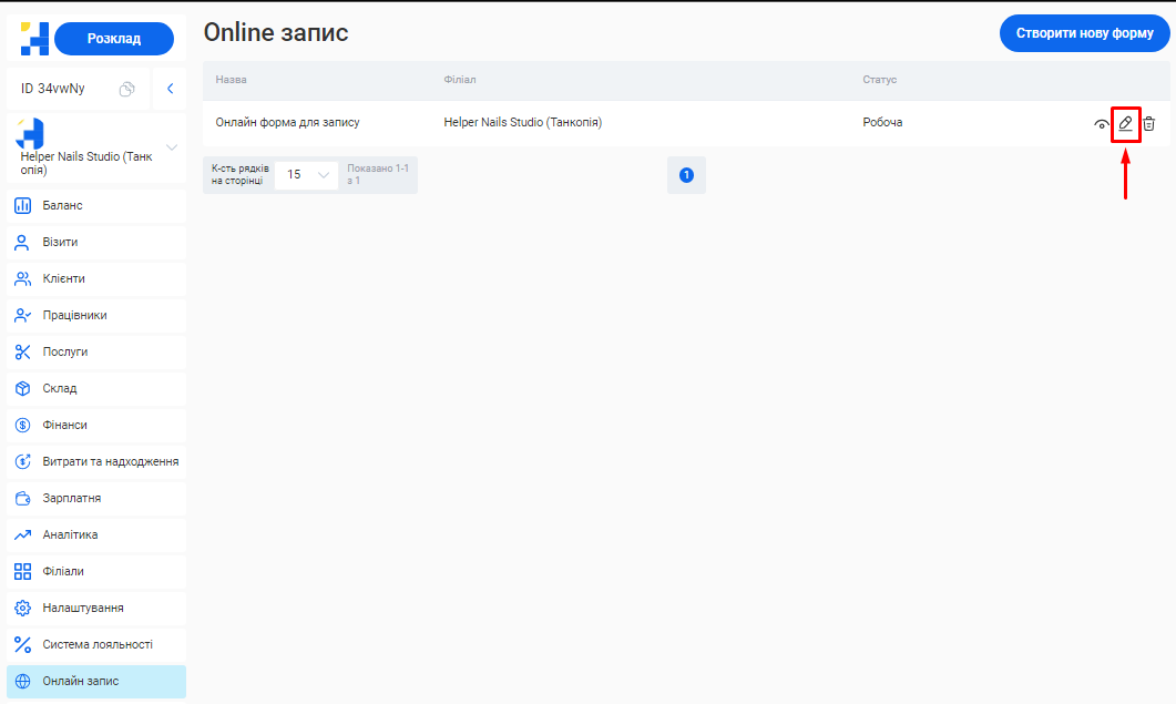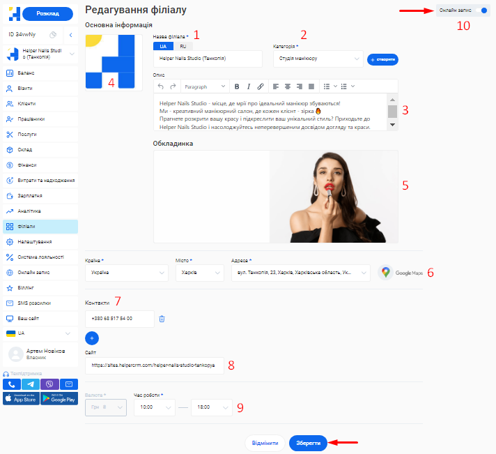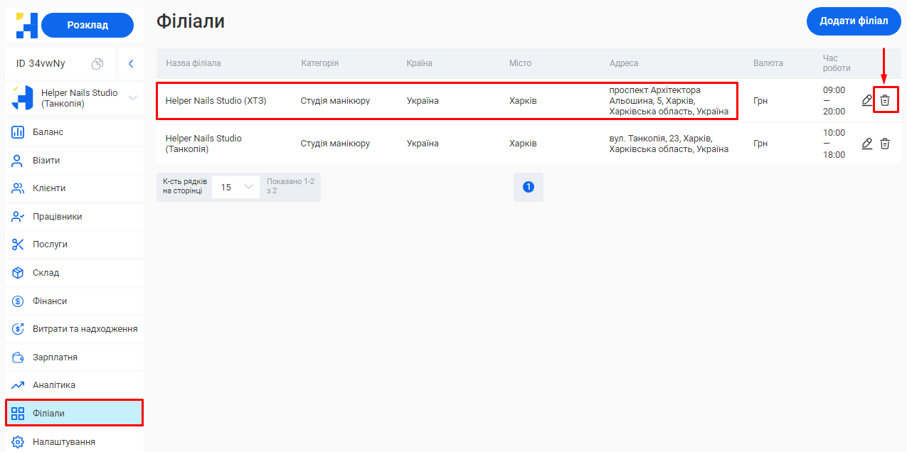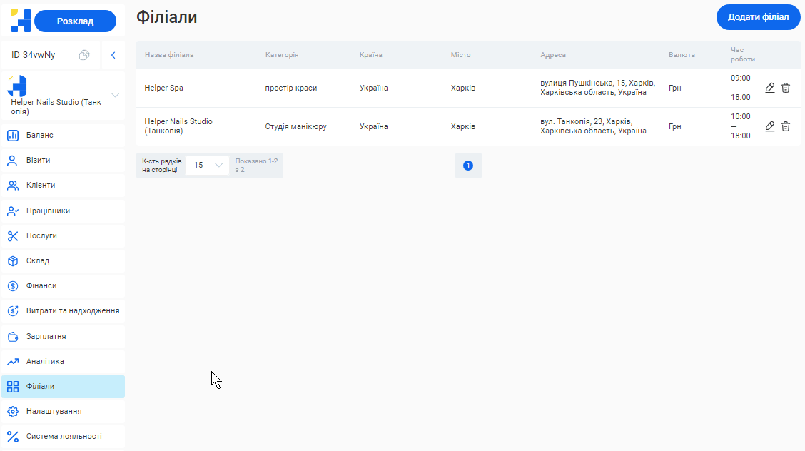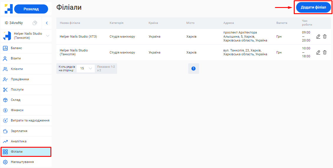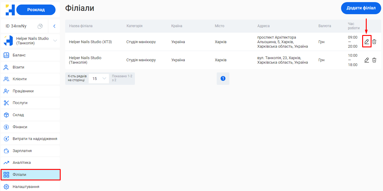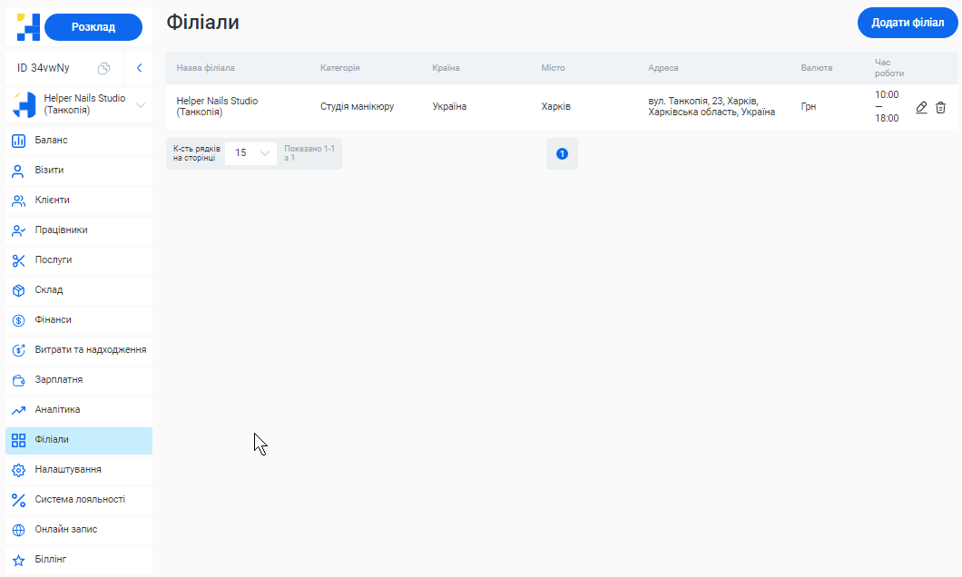 Додати новий філіал або відредагувати вже створений ви зможете у розділі «Філіали».