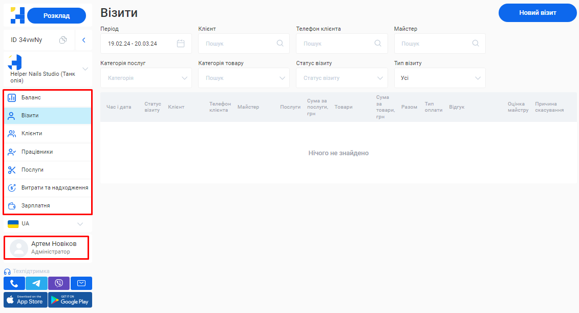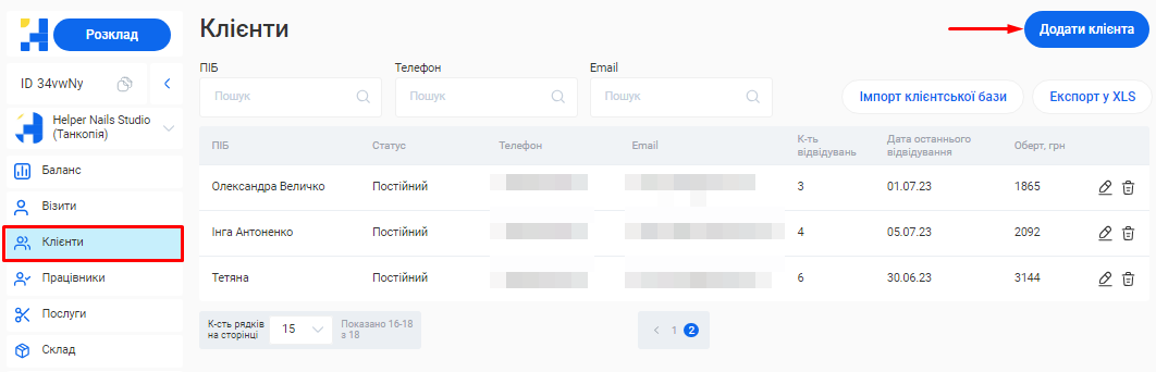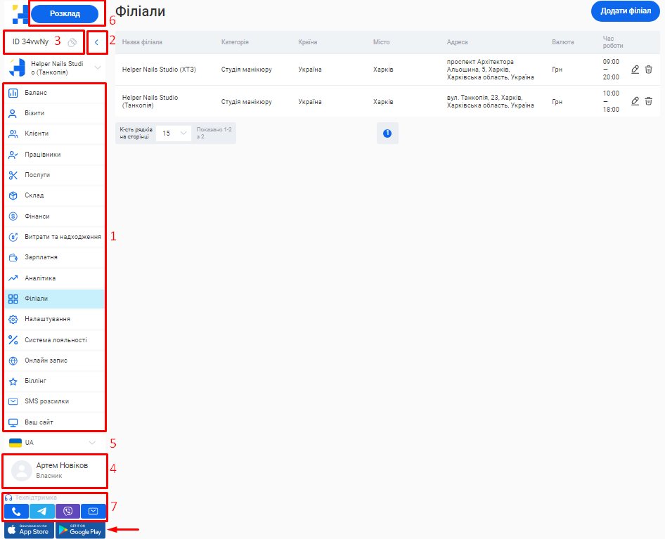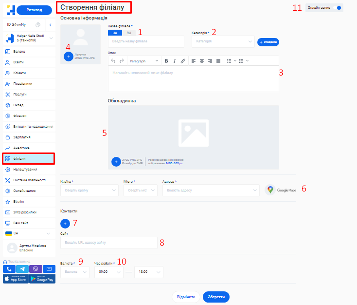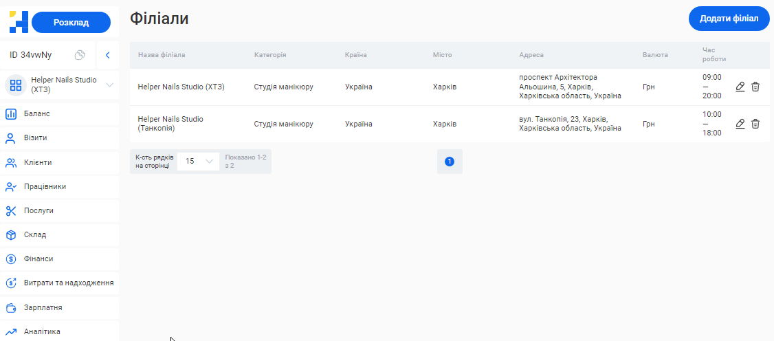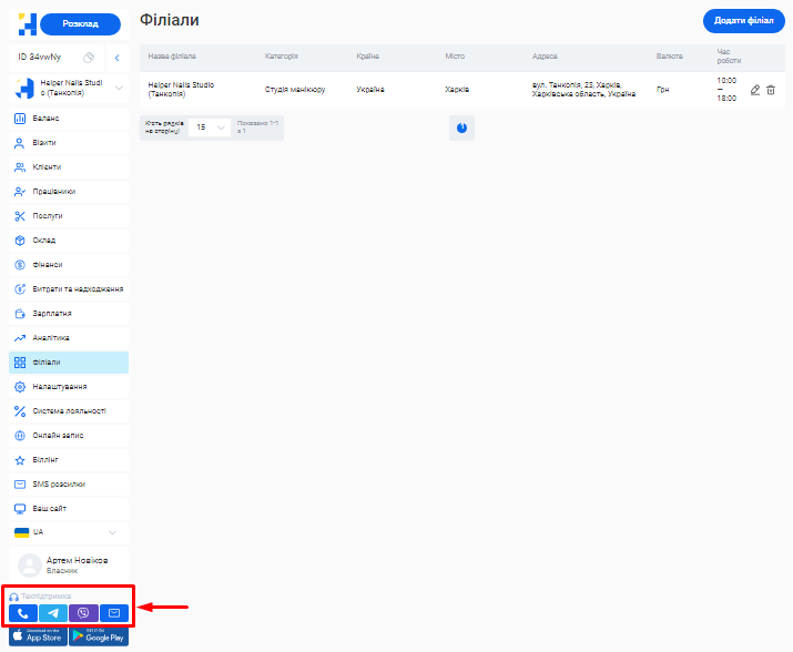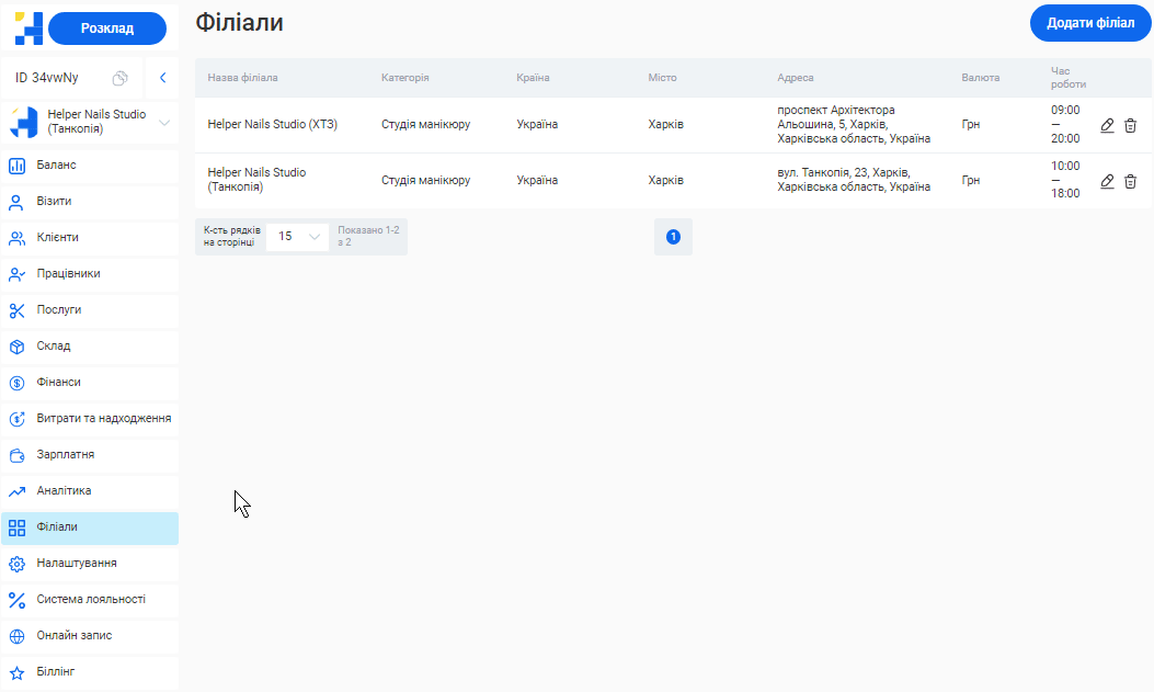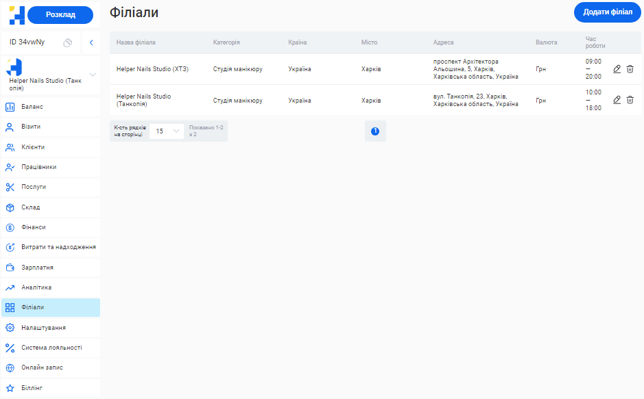 - У системі можливо створити необмежену кількість філіалів, кожен з яких матиме свою власну базу клієнтів, записів та звітності. Це дозволяє забезпечити відокремленість даних між філіями, конфіденційність та безпеку інформації.