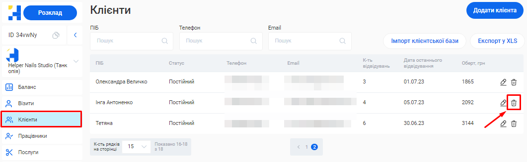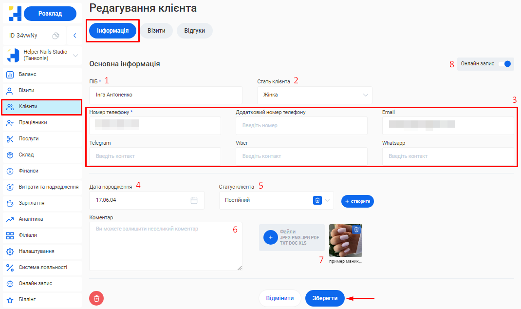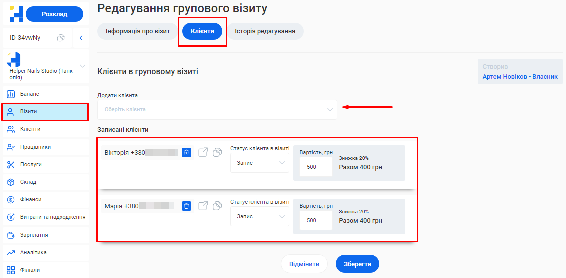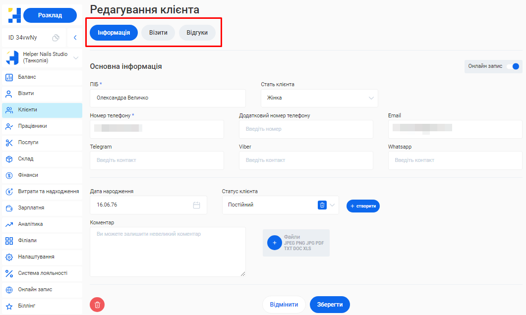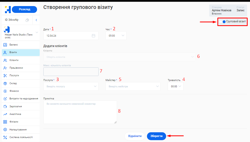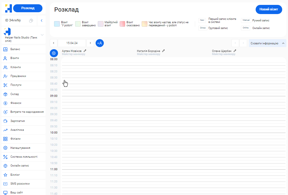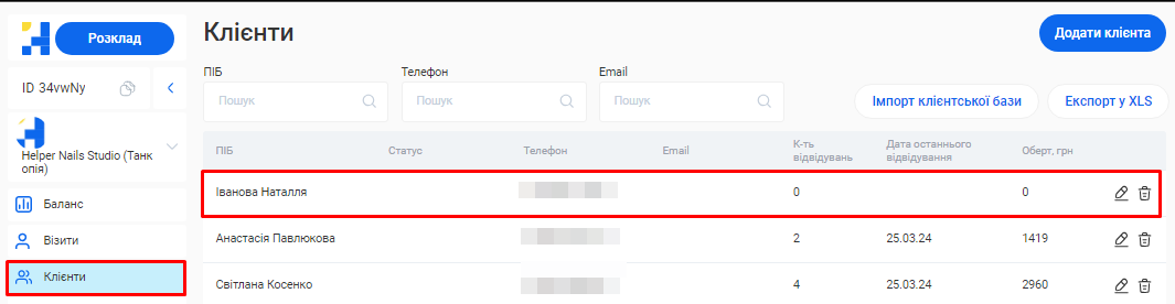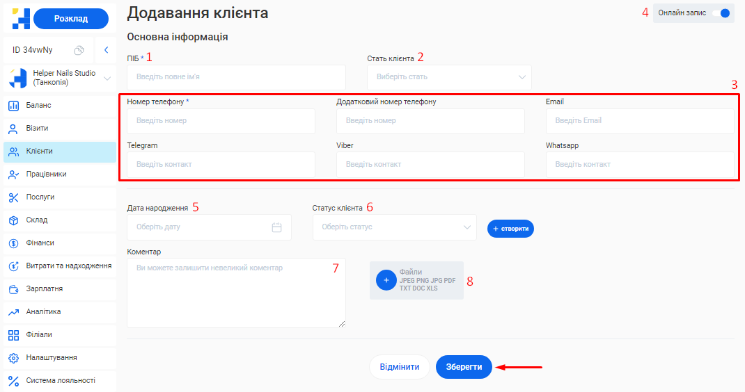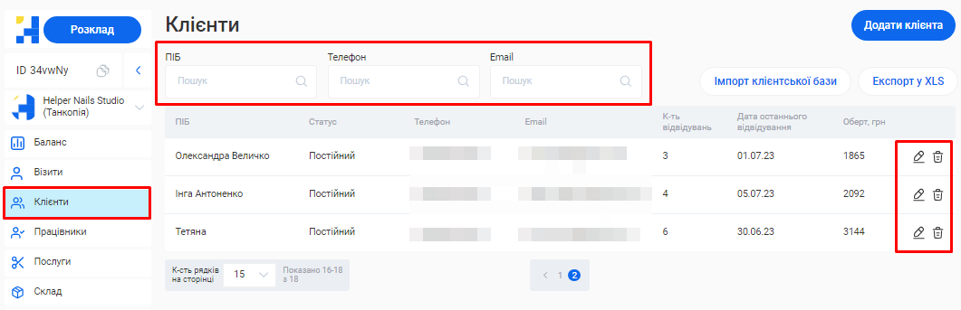 - У системі можливо створити необмежену кількість філіалів, кожен з яких матиме свою власну базу клієнтів, записів та звітності. Це дозволяє забезпечити відокремленість даних між філіями, конфіденційність та безпеку інформації.