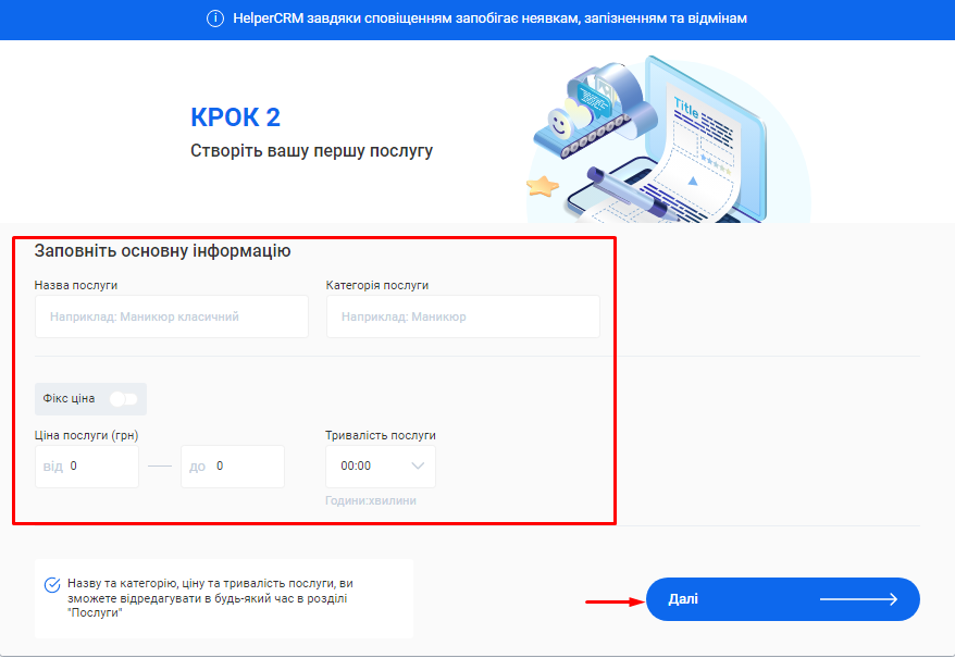 - В полі «Тривалість послуги» вкажіть орієнтовний час, який зазвичай потрібен для надання даного виду послуг.