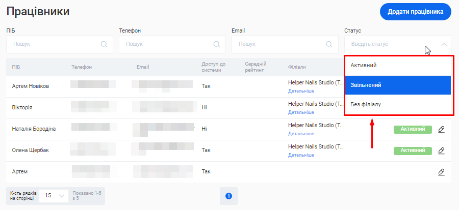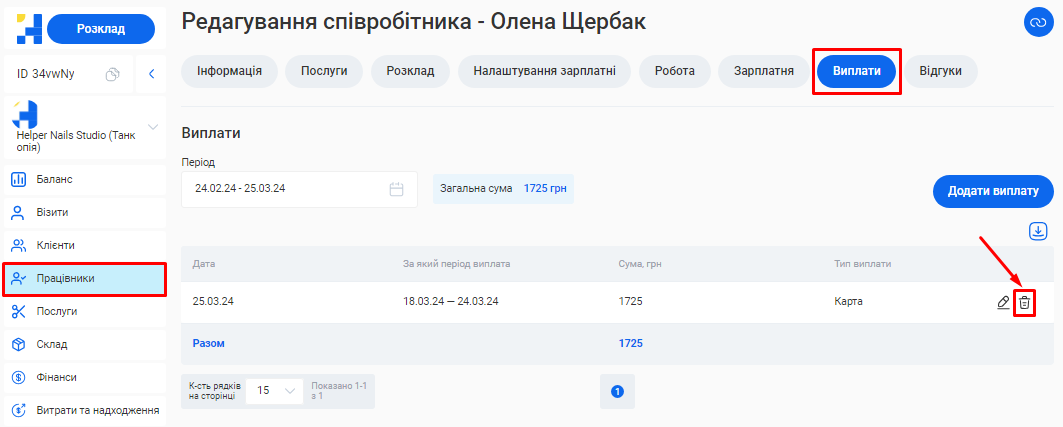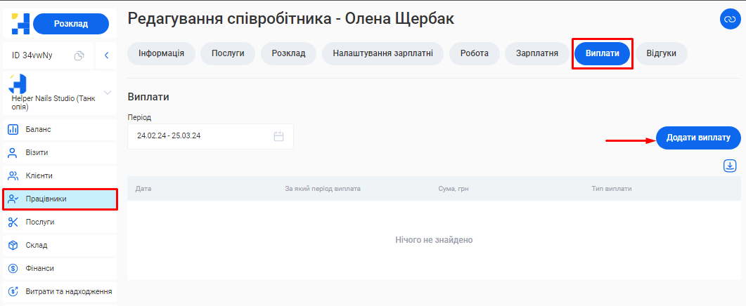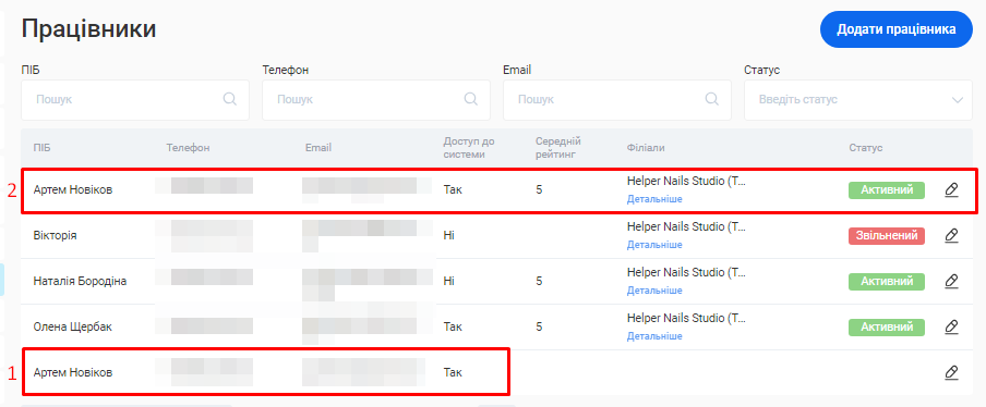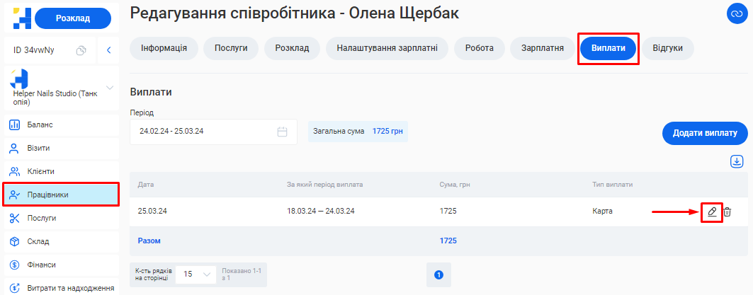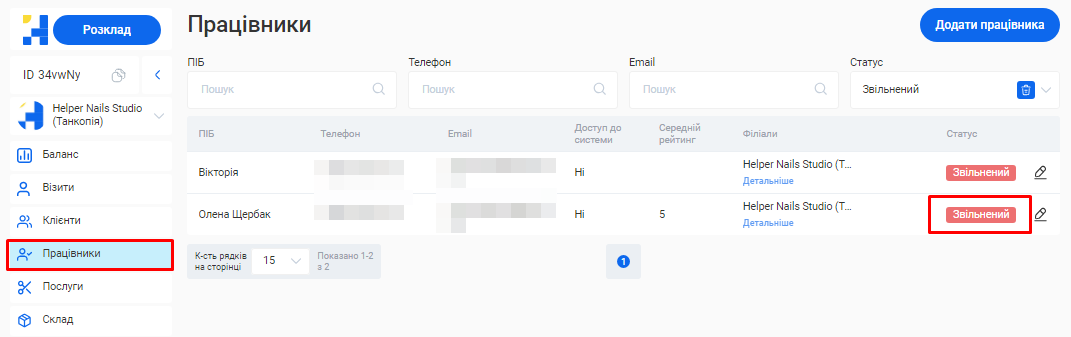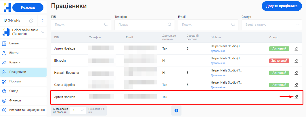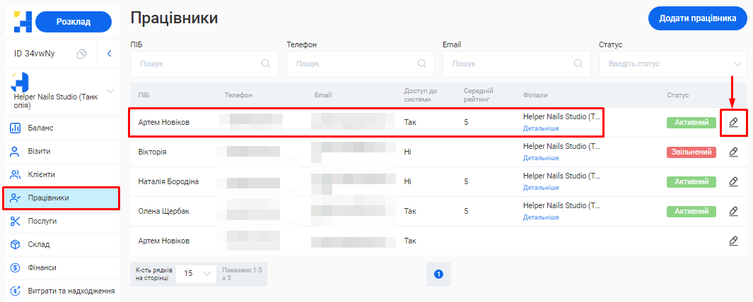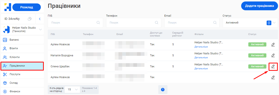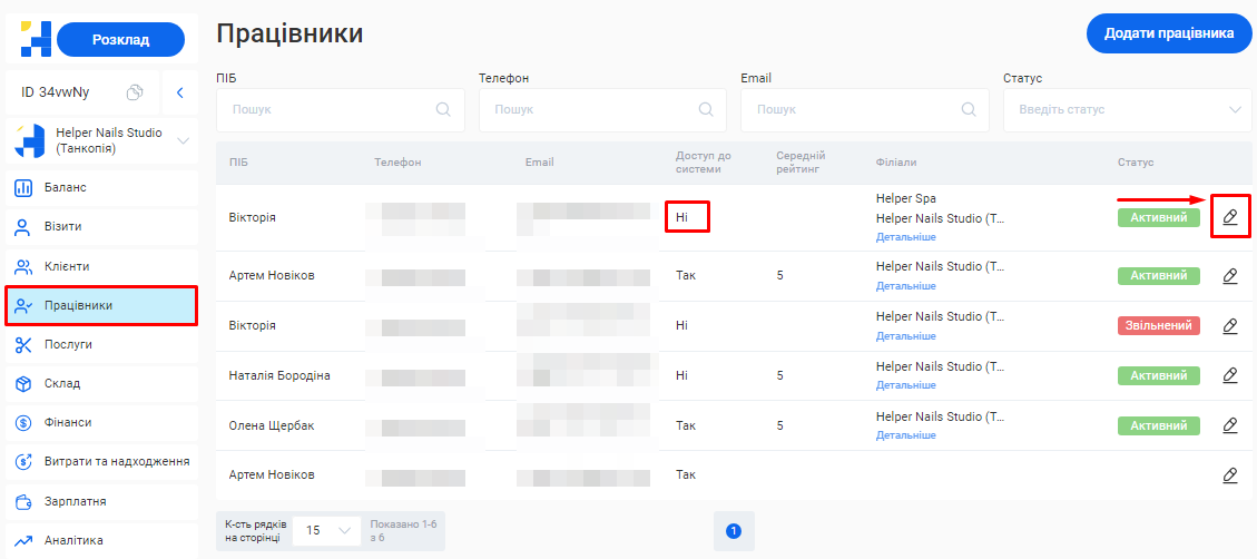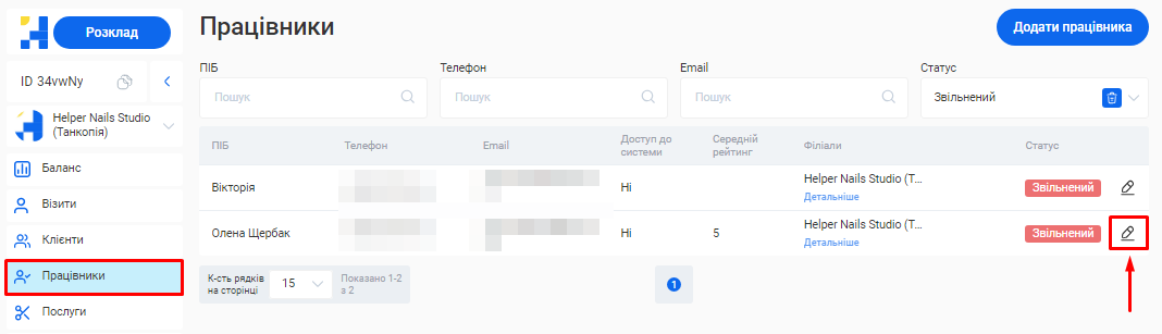 Відредагувати інформацію про співробітника ви зможете у розділі «Працівники» свого особистого кабінету.