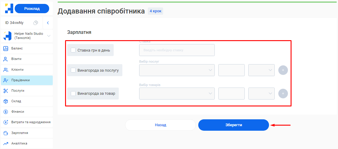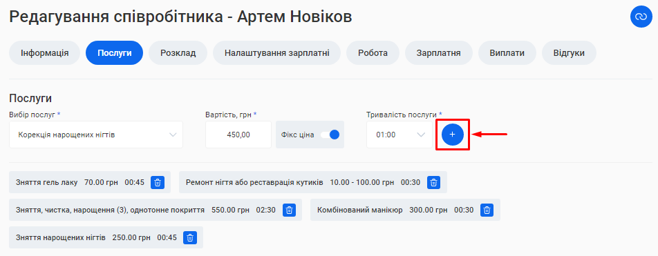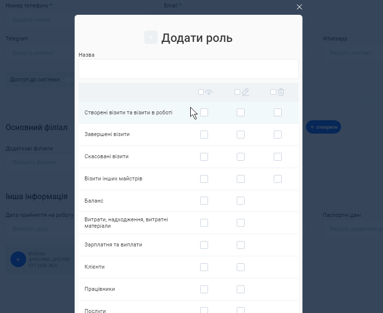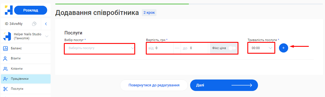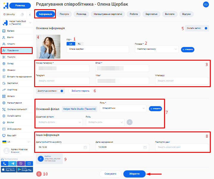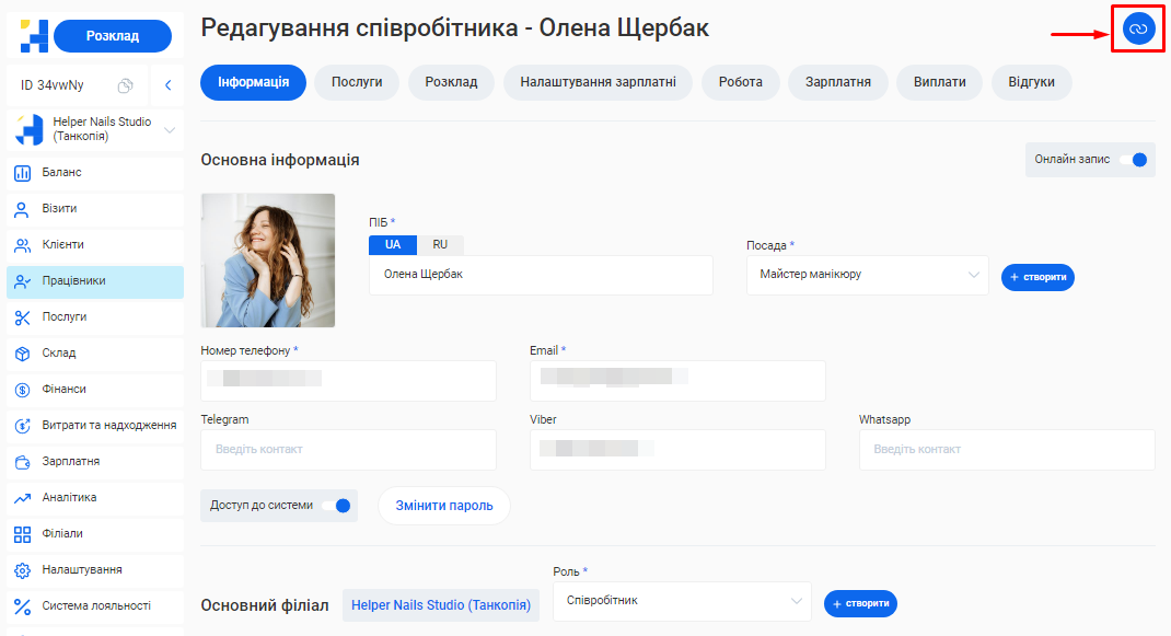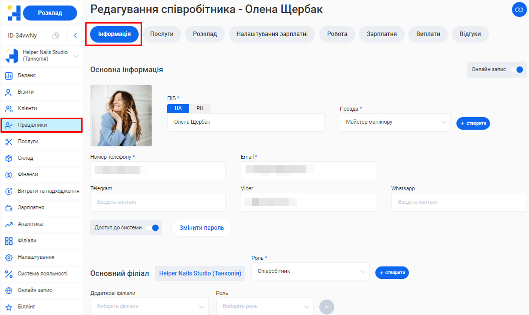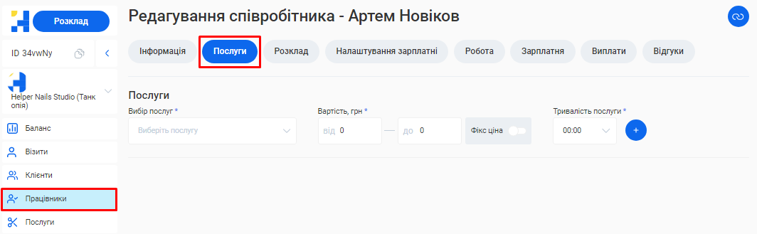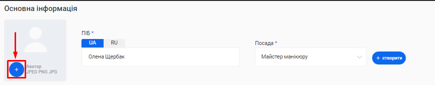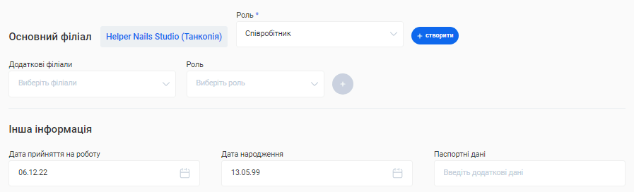 - В полі «Посада співробітника» вкажіть посаду, яку займає фахівець. Наприклад, Майстер манікюру, Перукар або Адміністратор.