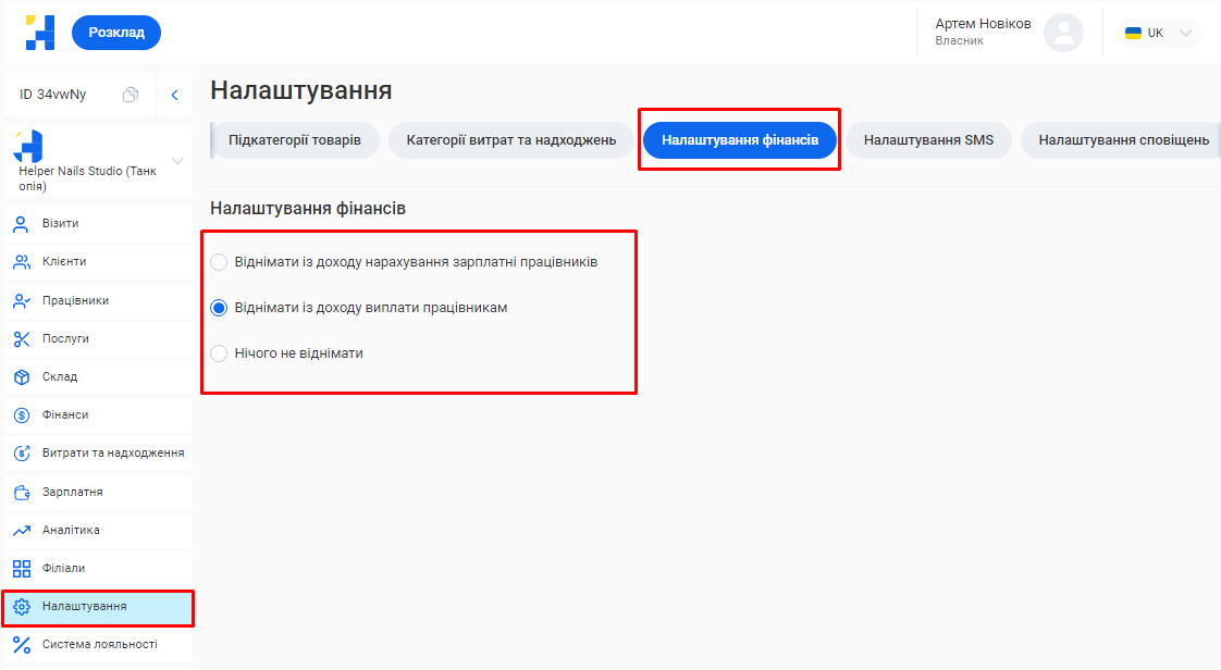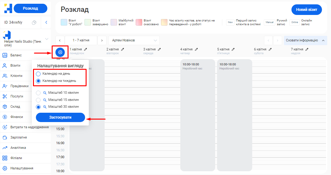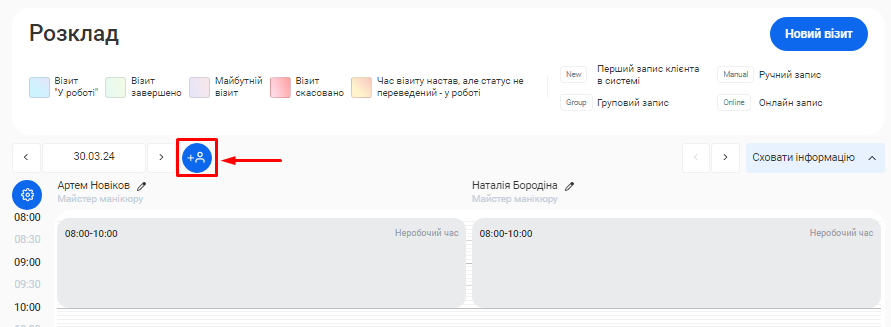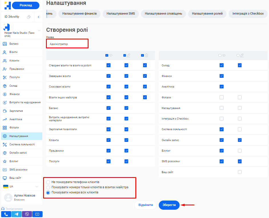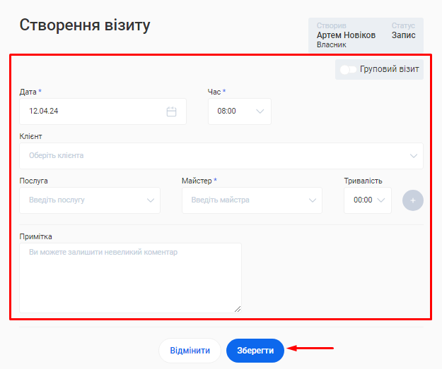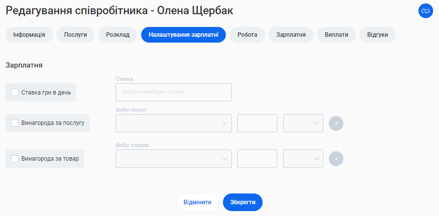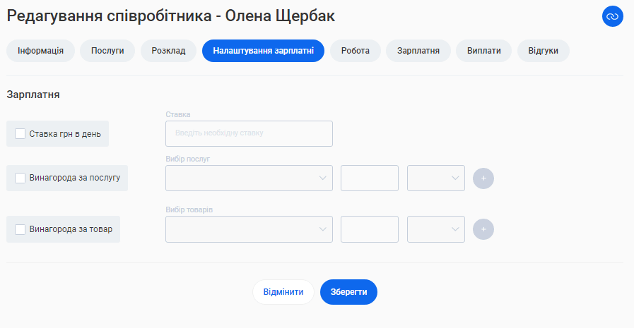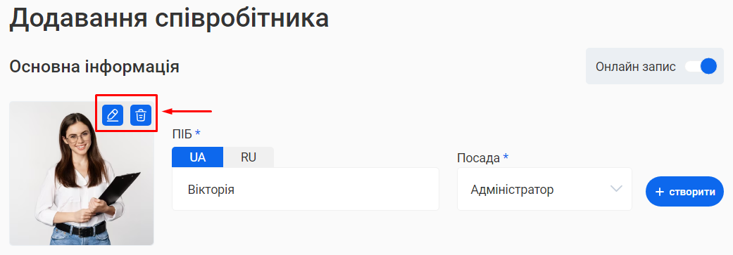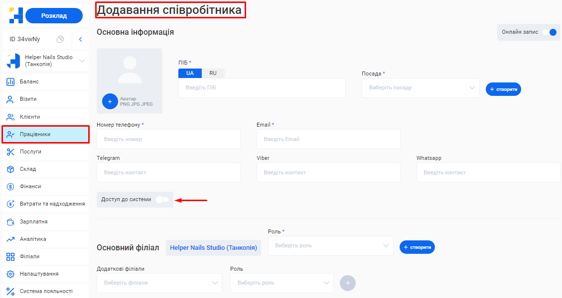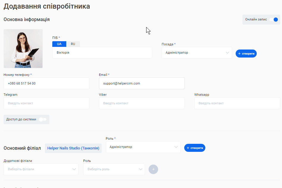 - В поле «Ім'я співробітника» введіть ім’я та прізвище фахівця. Це допоможе надалі ідентифікувати його в CRM та відображатиметься у формі online запису клієнтів.