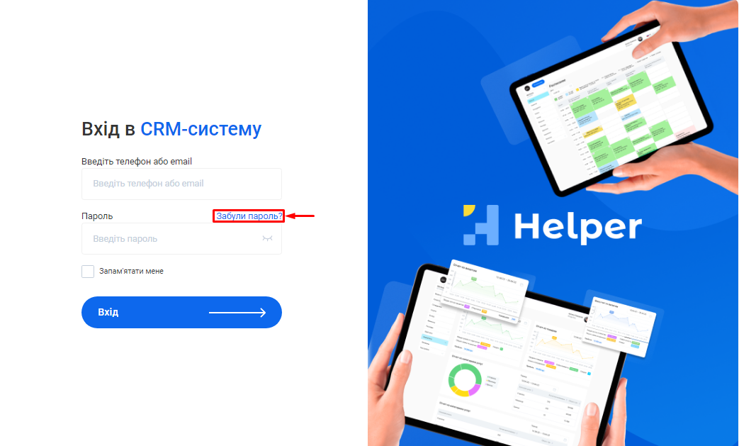 2. Натисніть на надпис «Забули пароль?» в формі входу в CRM-систему.