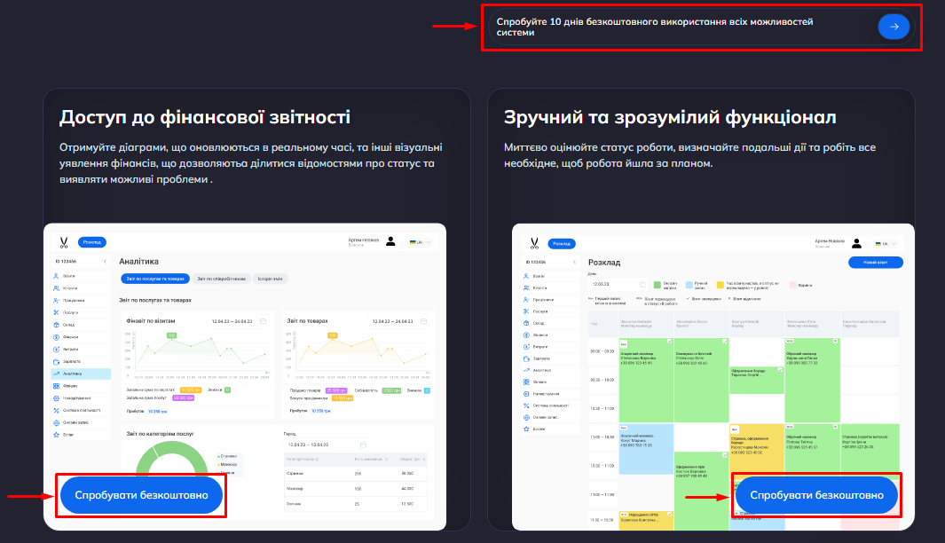 - Варіант 1. Натисніть на кнопку «Спробуйте 10 днів безкоштовного використання всіх можливостей системи» або «Спробувати безкоштовно» на головній сторінці сайту.