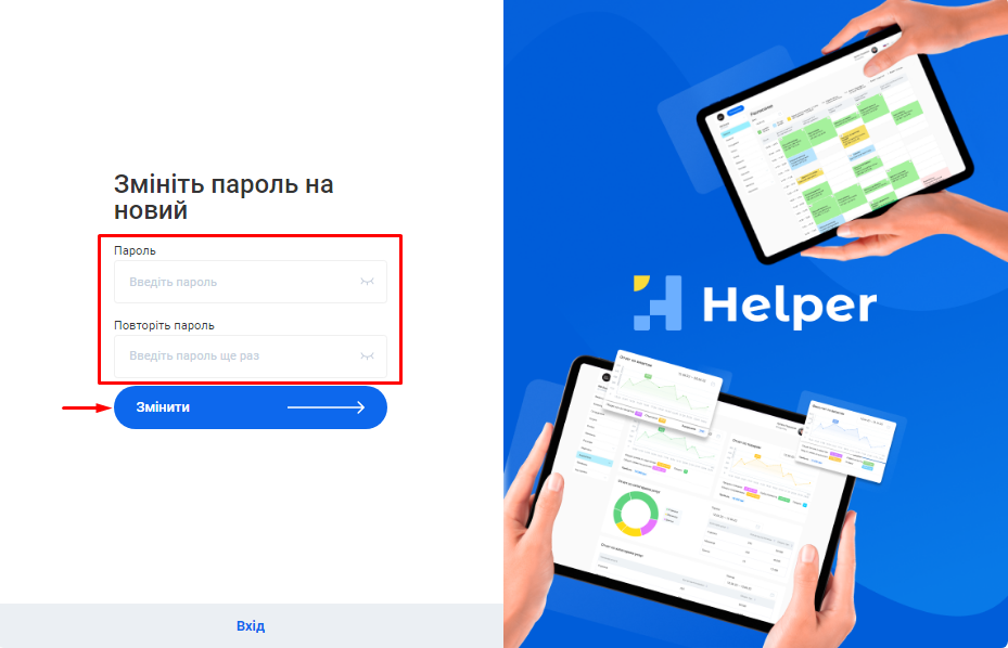 Ви можете приховати або відобразити введену інформацію, натиснувши на іконку Ока у правій частині поля «Пароль» та «Повторіть пароль». |