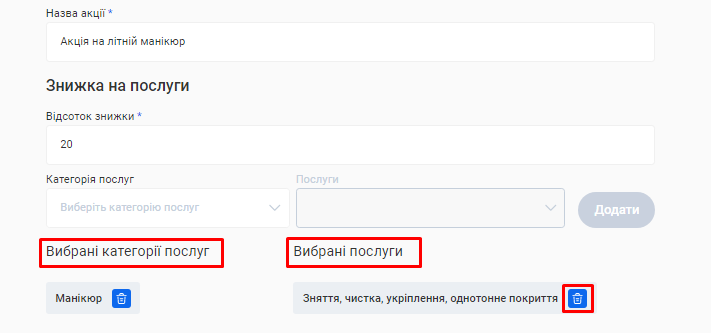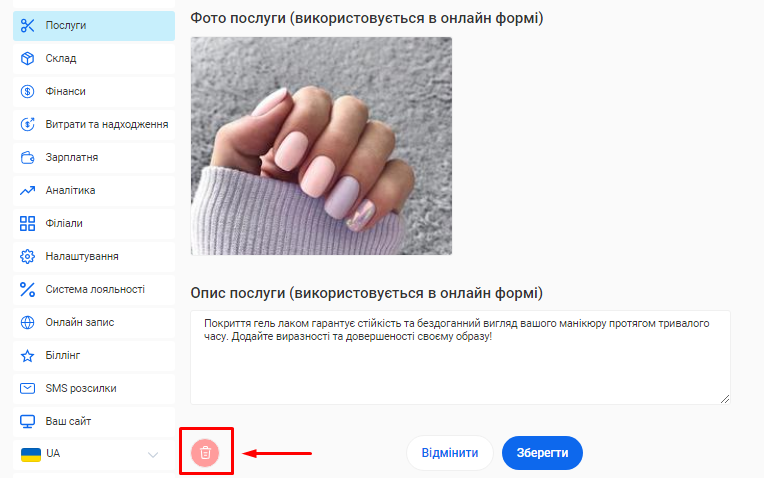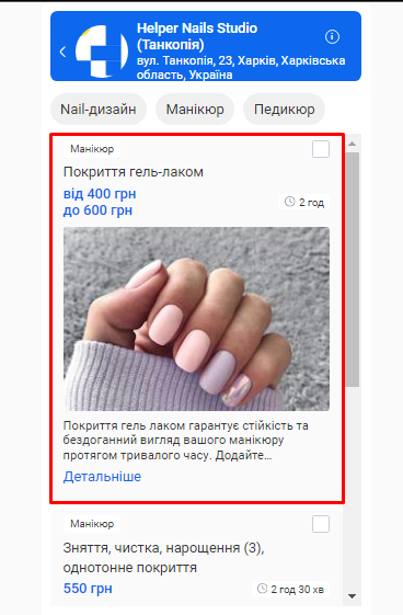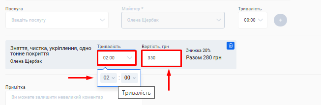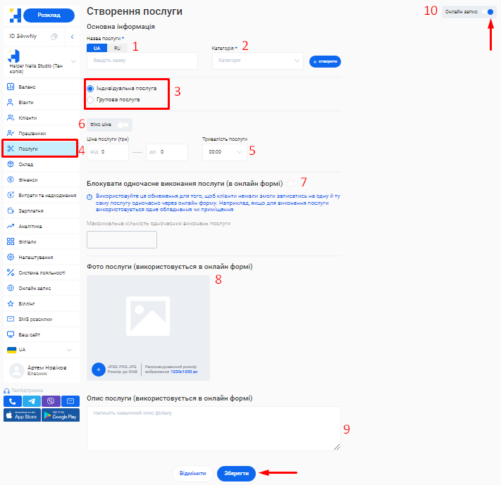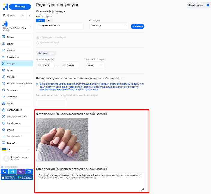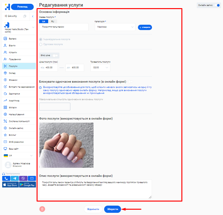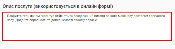 - В поле «Назва послуги» введіть коротку назву, яка описує сутність послуги, що надається. Наприклад, Комбінований манікюр.