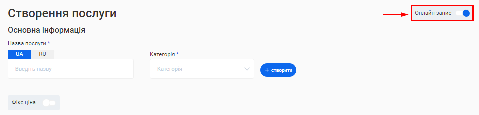 - Перемикач «Фіксована ціна» вказує чи змінюється ціна залежно від якихось факторів. Якщо ви встановите перемикач в активне положення, це означатиме, що вартість послуги є сталим значенням і не змінюється.