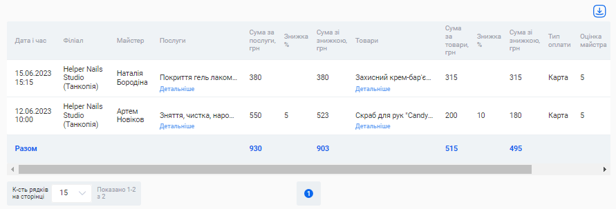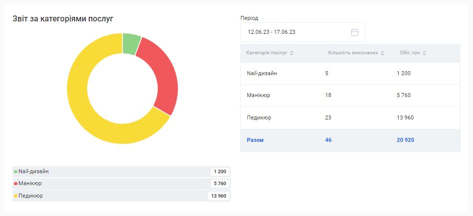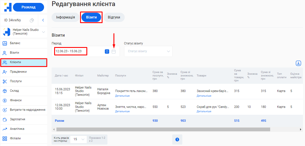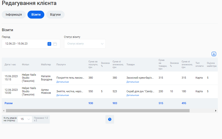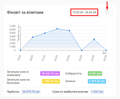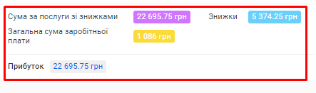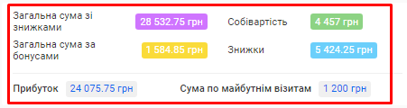 - Загальна сума знижок. Сума знижок, зроблених на послуги та товари по всім візитам за обраний період.