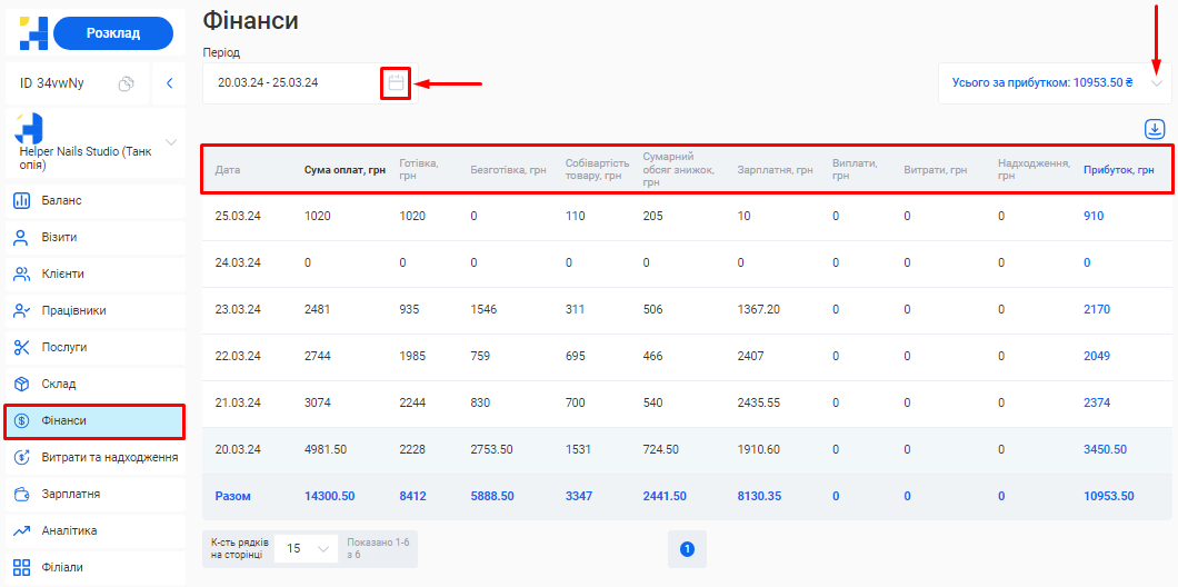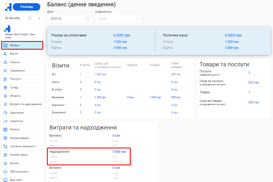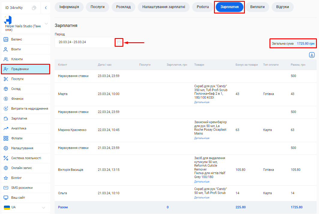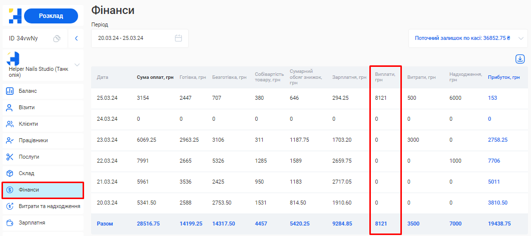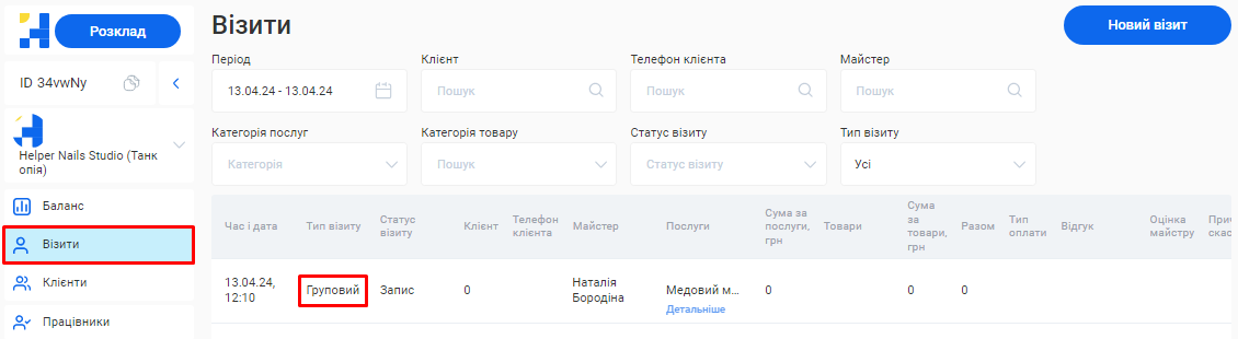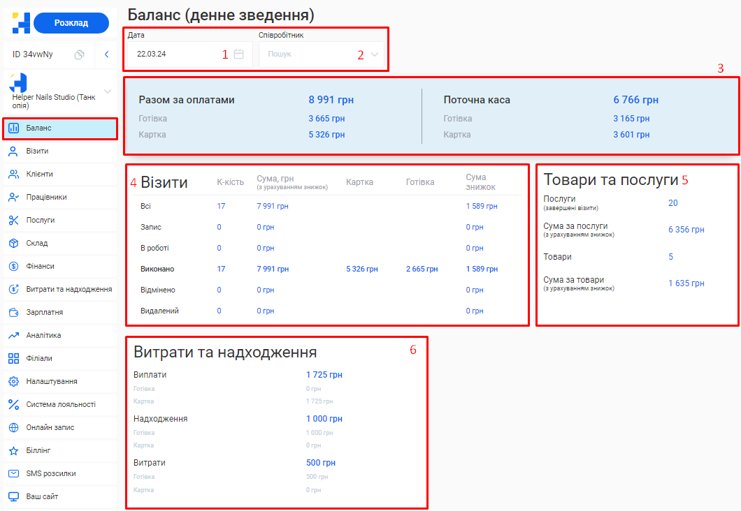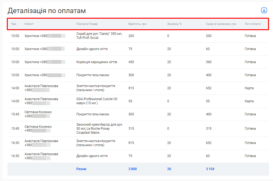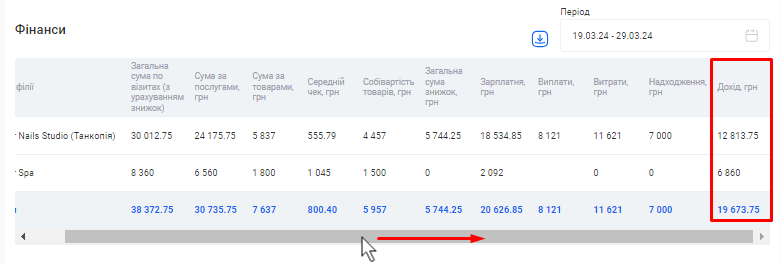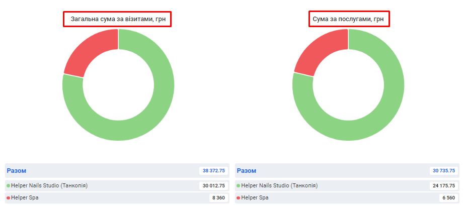 - Загальна сума по візитах. Це загальна сума коштів, отримана за надання послуг та продаж товарів за встановлений період (вже з урахуванням наданих акційних знижок та бонусів по знижковим карткам).