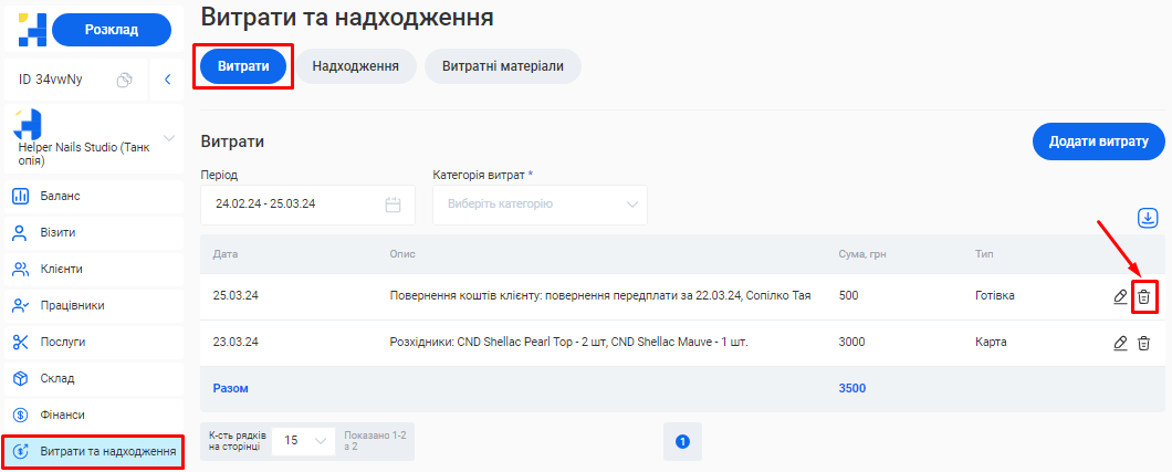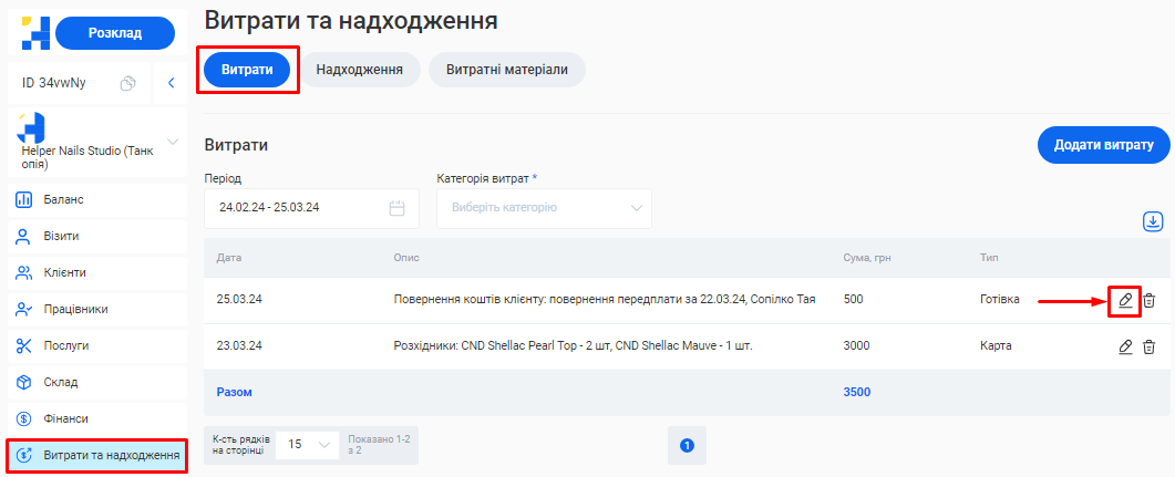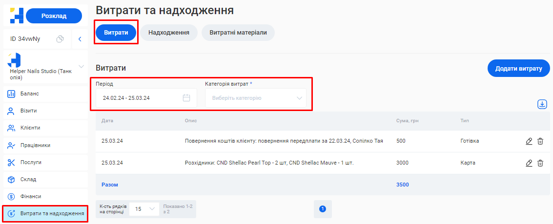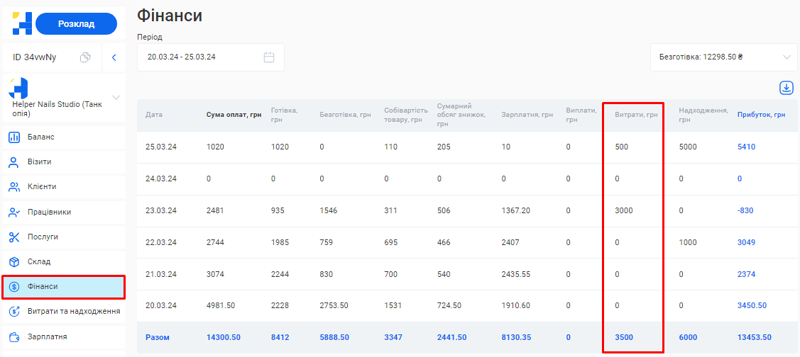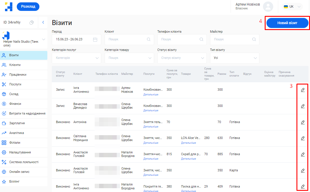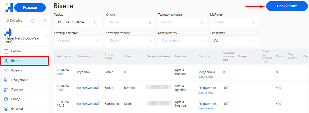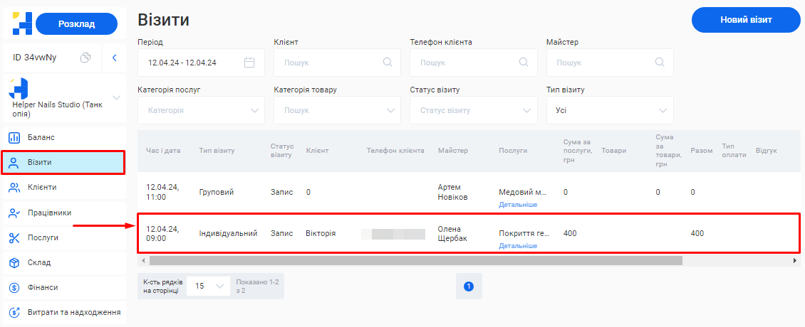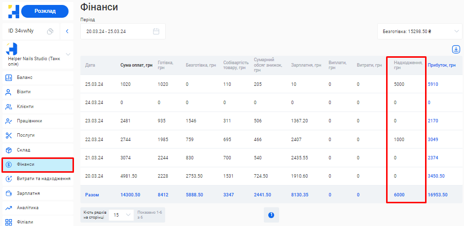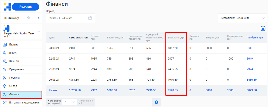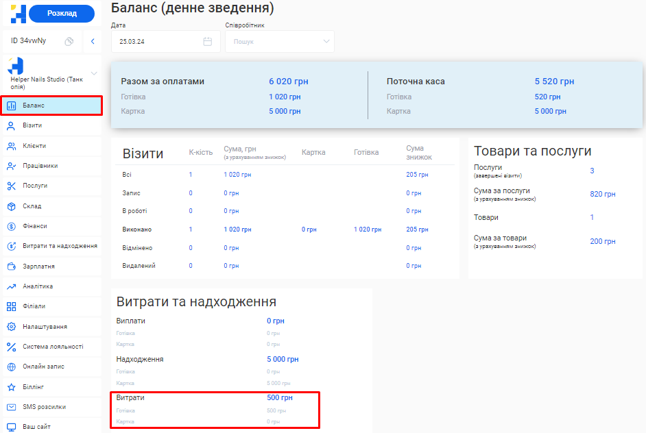 - Загальна сума по візитах. Це загальна сума коштів, отримана за надання послуг та продаж товарів за встановлений період (вже з урахуванням наданих акційних знижок та бонусів по знижковим карткам).
