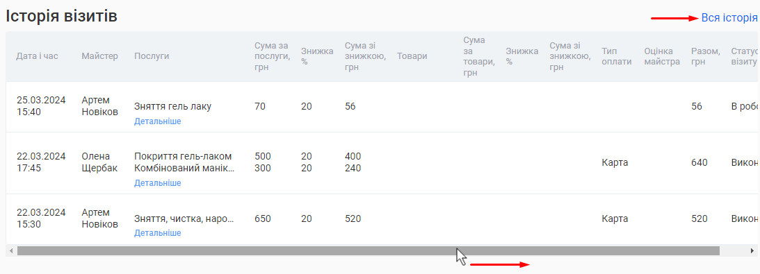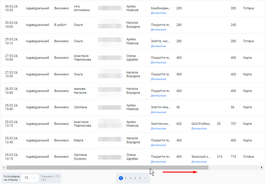 Примітка! Щоб відобразити всі стовпці з інформацією, затисніть лівою кнопкою миші смугу прокручування внизу таблиці та пересувайте мишку праворуч. |