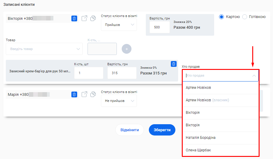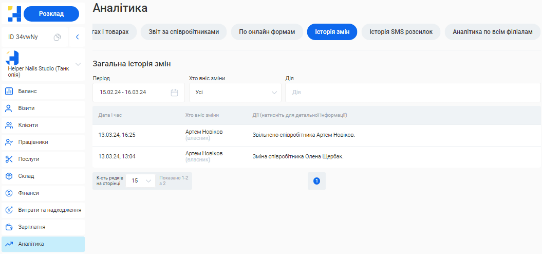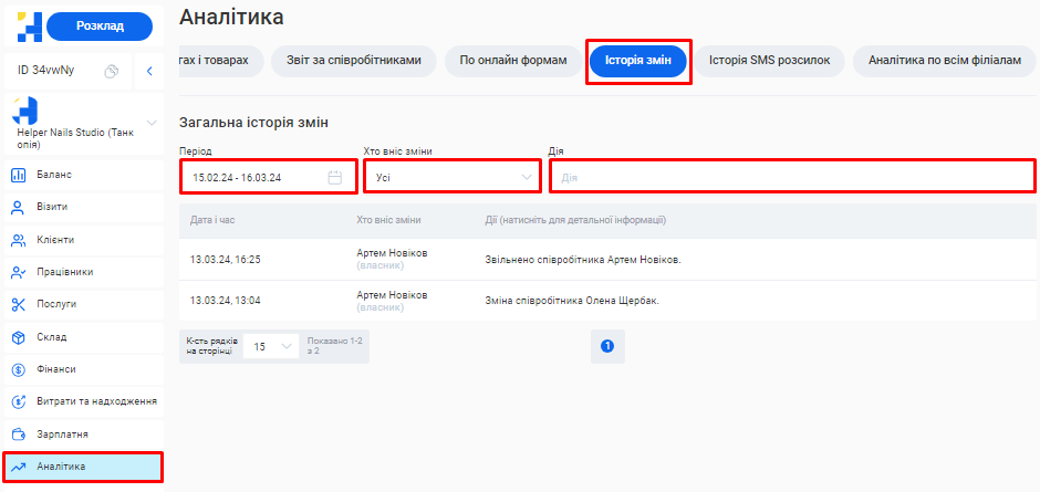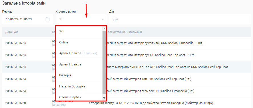 - Подивитися дії окремого співробітника або обрати тільки зміни, внесені онлайн (наприклад, онлайн записи). Для цього натисніть на поле «Хто вніс зміни» та оберіть потрібний пункт.