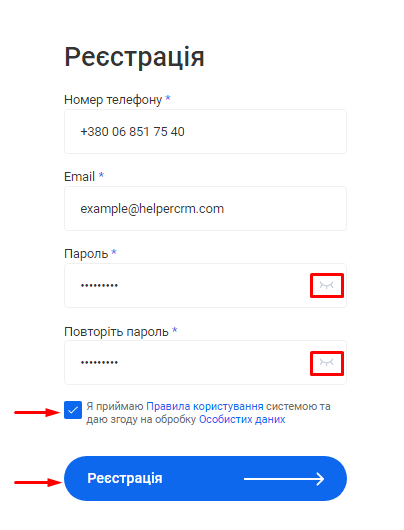 Примітка! Для реєстрації у системі CRM можуть бути використані лише українські номери (з кодом +380). |