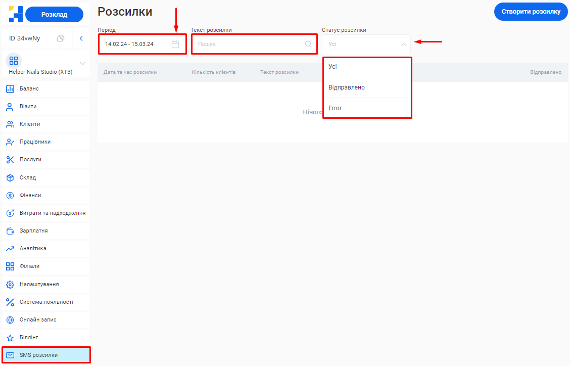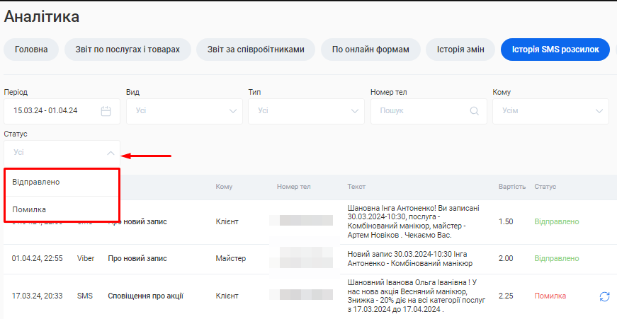 - Відфільтрувати розсилки за статусом у полі «Статус». Розсилки можуть мати статус “Відправлено” (успішно надіслано отримувачу) та “Помилка” (розсилку не було відправлено через якусь причину. Наприклад, недостатньо коштів на SMS-рахунку тощо).