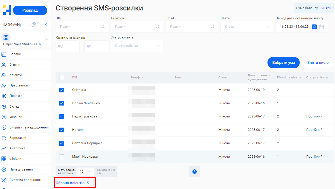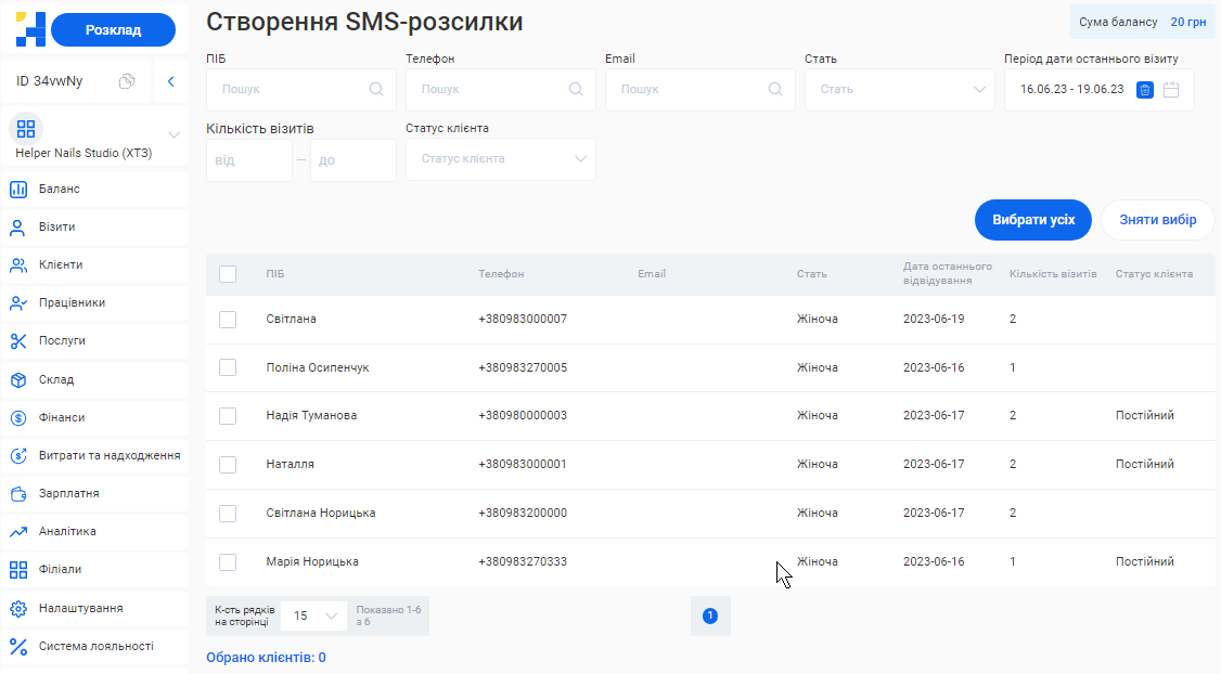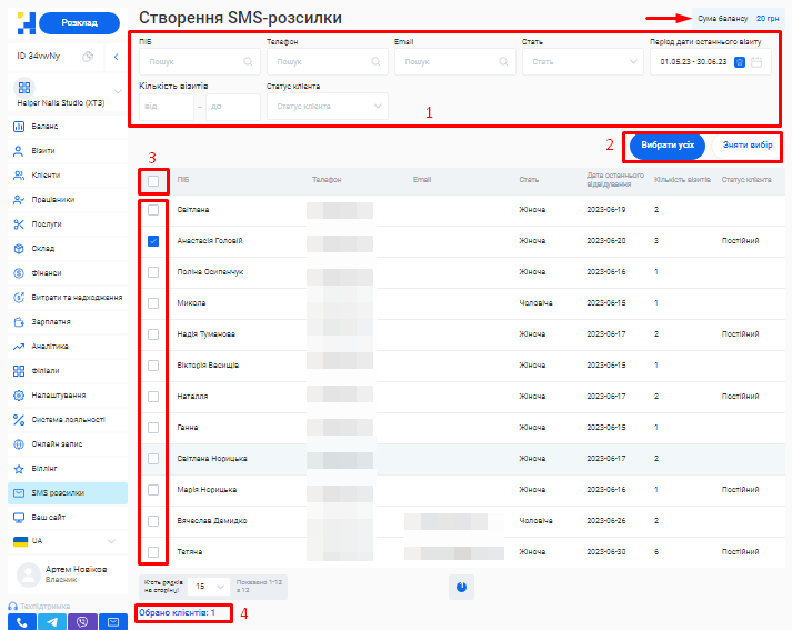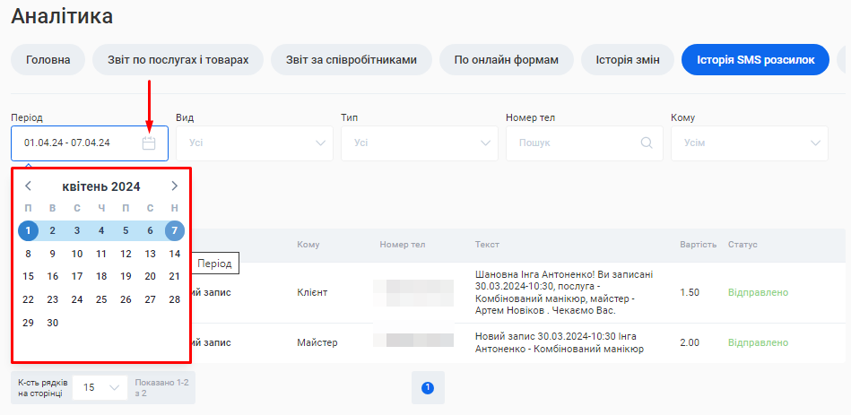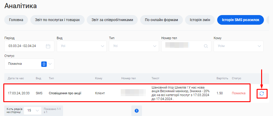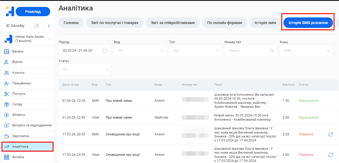 - Переглянути всі розсилки, які було відправлено конкретній людині. Для цього введіть у поле «Номер тел» телефон потрібного клієнта, майстра або власника.