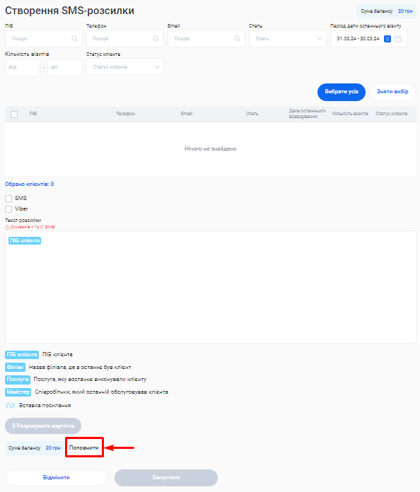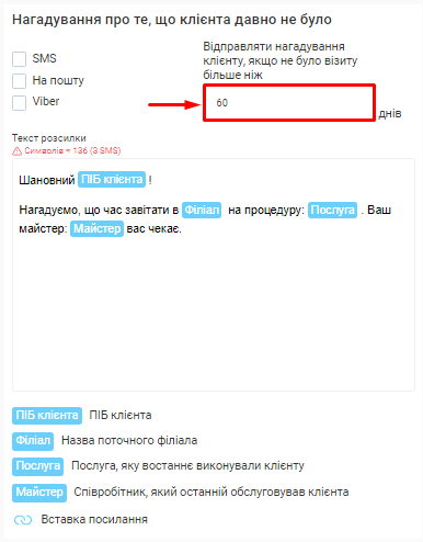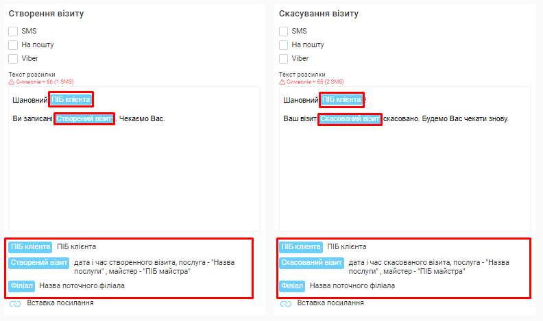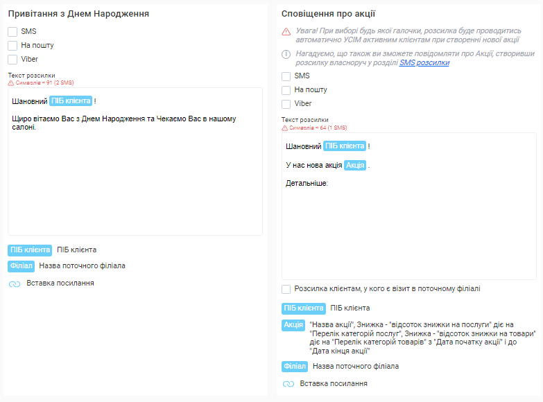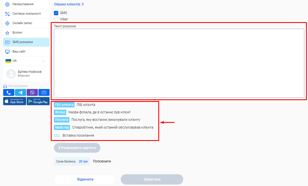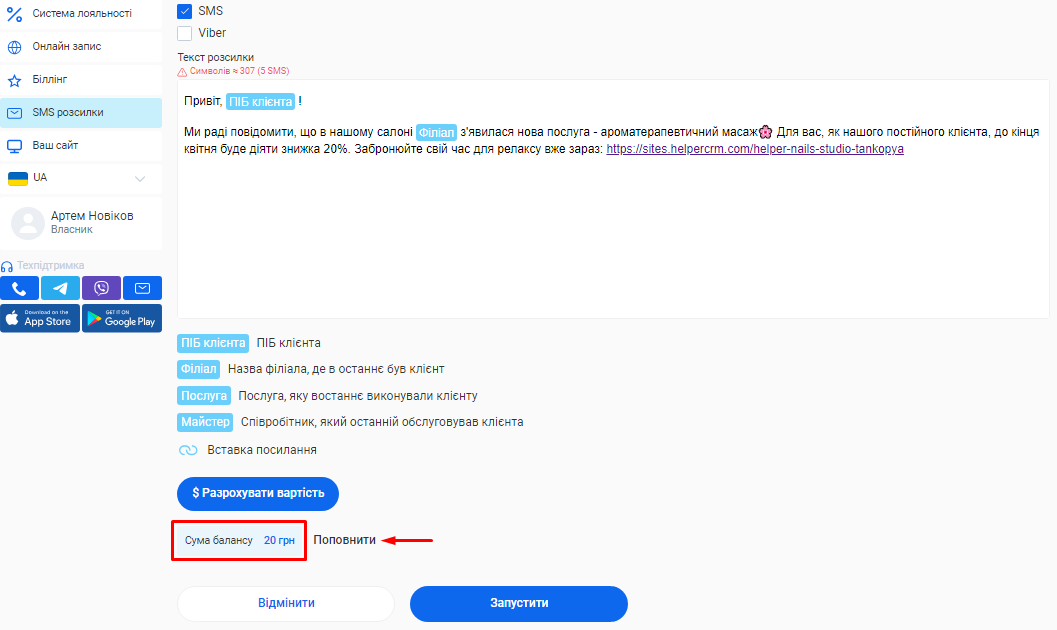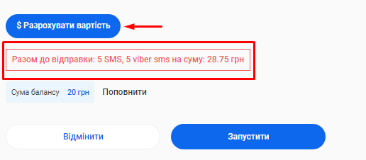 - Вартість кожної розсилки. Вона напряму залежить від каналу відправки (Viber чи SMS) та кількості символів у тексті повідомлення.