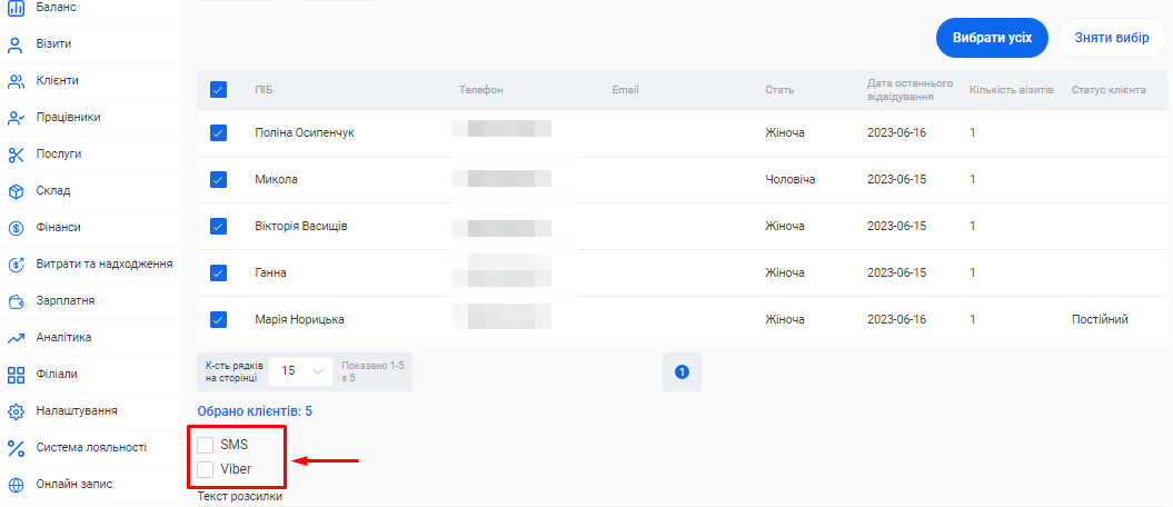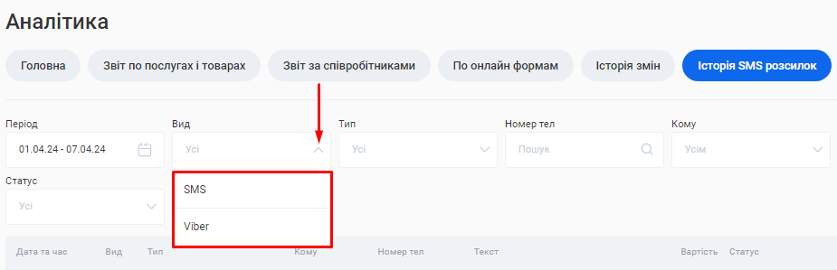 - Відфільтрувати розсилки за видом. Для цього оберіть з переліку у полі «Вид» необхідний варіант: Усі, SMS або Viber.