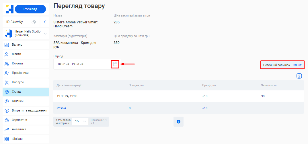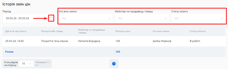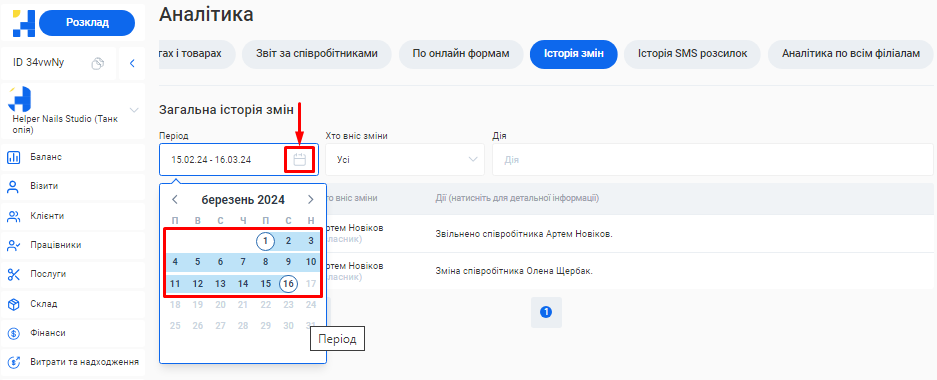 - Обрати період, за який потрібно переглянути історію змін. Для цього натисніть на позначку календаря в полі «Період» у шапці розділу та встановіть необхідний проміжок дат.