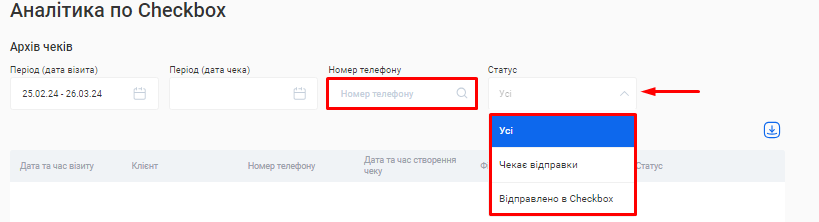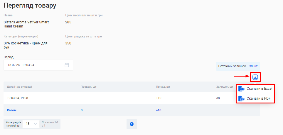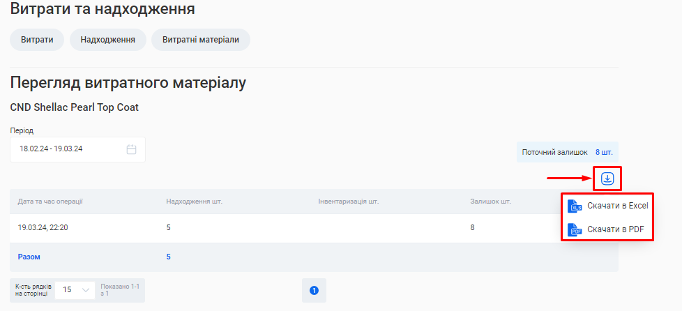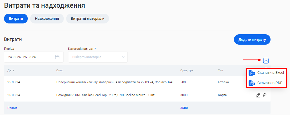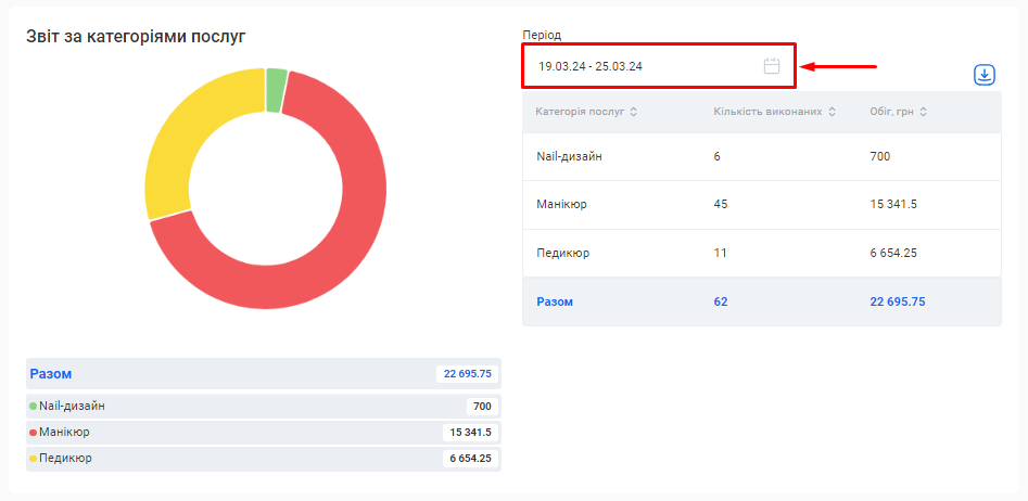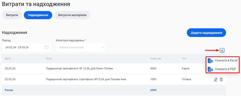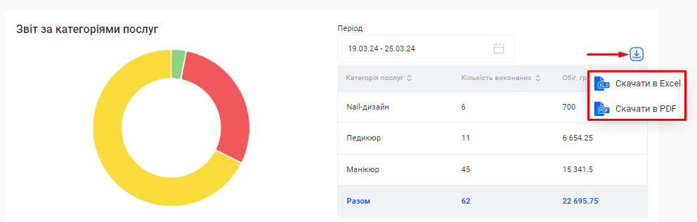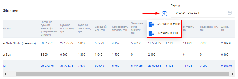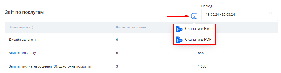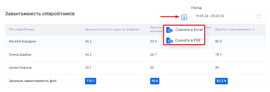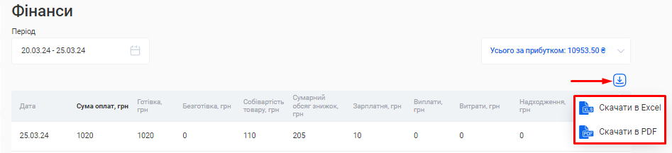 Ви можете вивантажити з CRM даний звіт одним файлом. Для цього натисніть на позначку Завантаження, що розташована зліва від поля «Період», та оберіть варіант “Скачати в Excel” або “Скачати в PDF”.