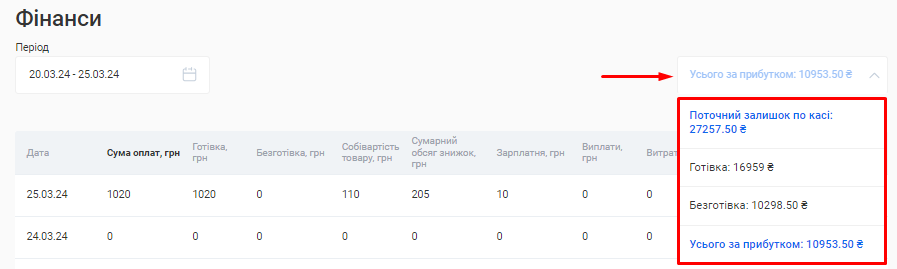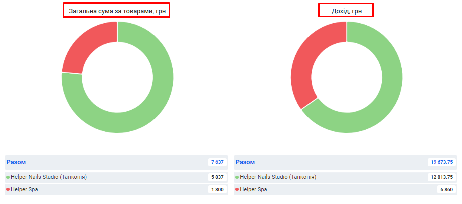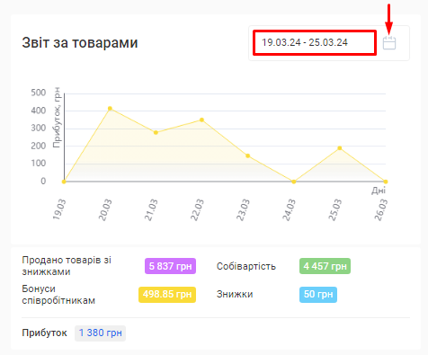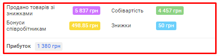 - Сума за товарами. Це сума коштів, отримана за продаж товарів клієнтам за встановлений період (вже з урахуванням акційних знижок та бонусів по знижковим карткам).