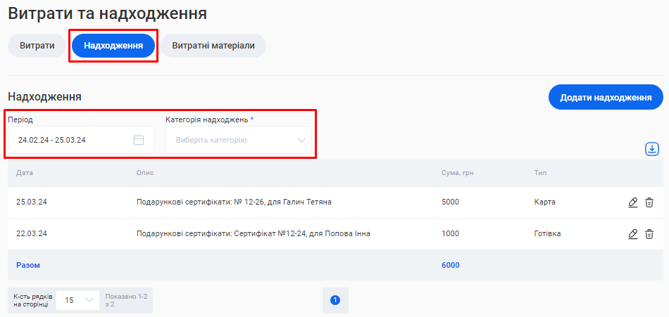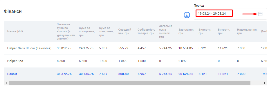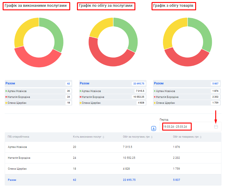 Примітка! Ви можете самостійно налаштувати період, за який буде відображено звітність. Для цього натисніть на позначку календаря у правому верхньому кутку поля «Період» біля потрібної таблиці. |