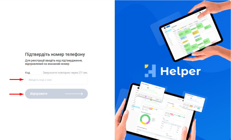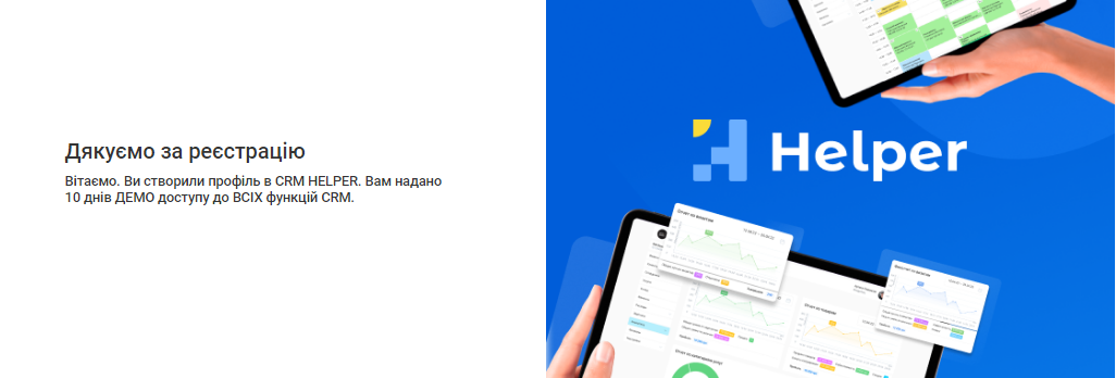 Ваша реєстрація у Helper CRM успішно завершена. Тепер ви можете увійти до свого облікового запису та почати налаштування першого філіалу.