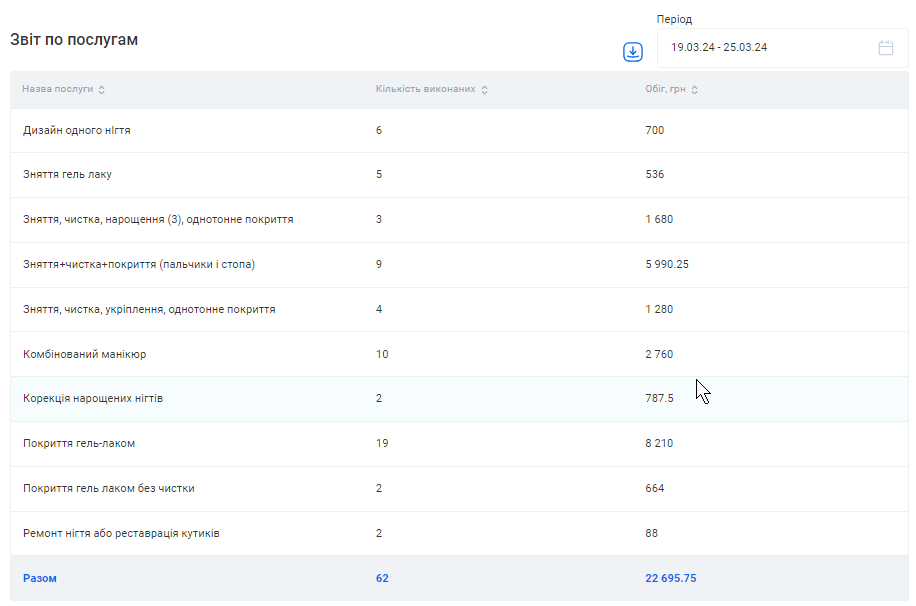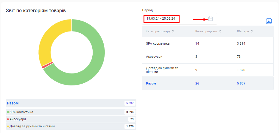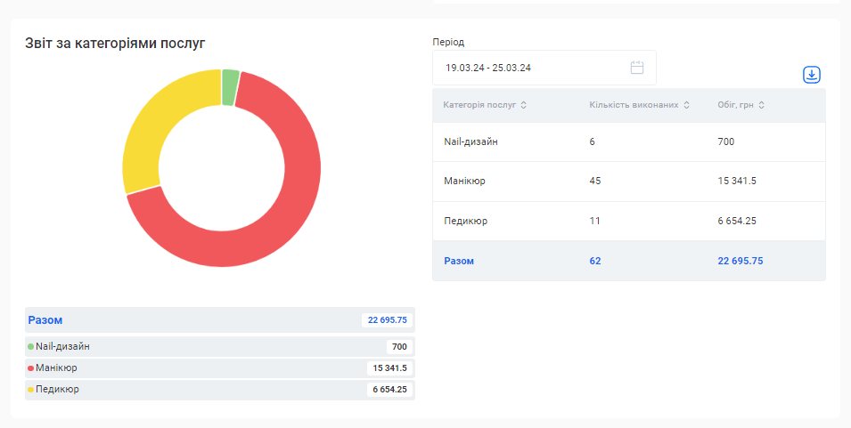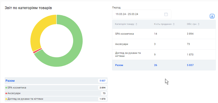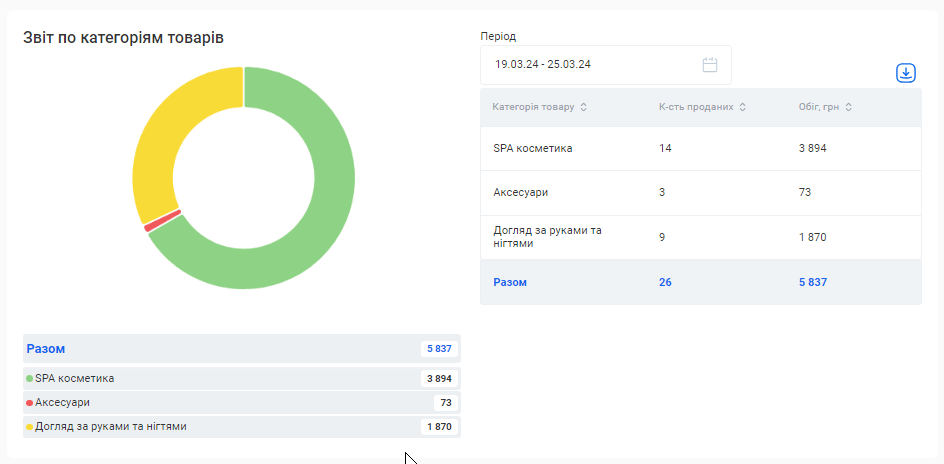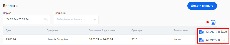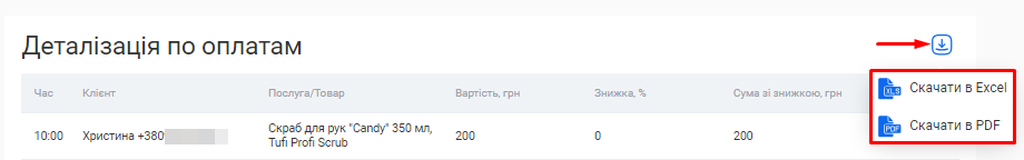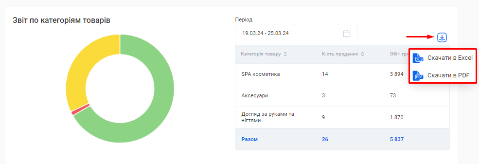Цей звіт також можливо скачати. Для цього натисніть на позначку Завантаження, що розташована зліва від поля «Період», та оберіть варіант “Скачати в Excel” або “Скачати в PDF”.
