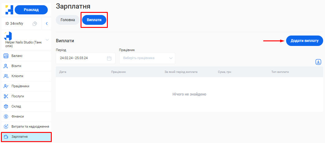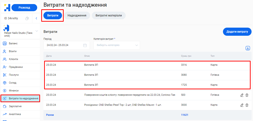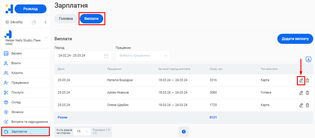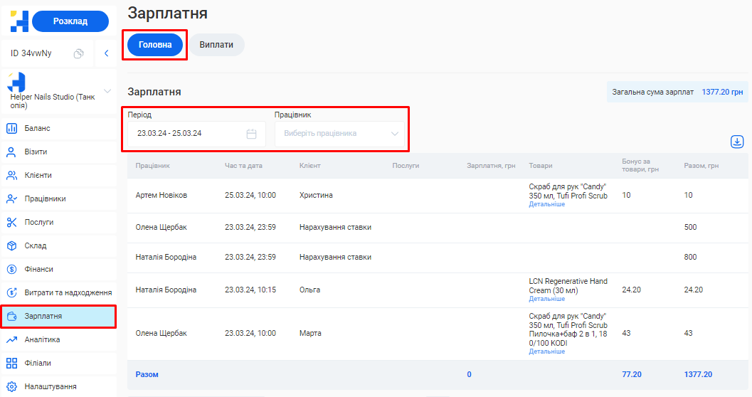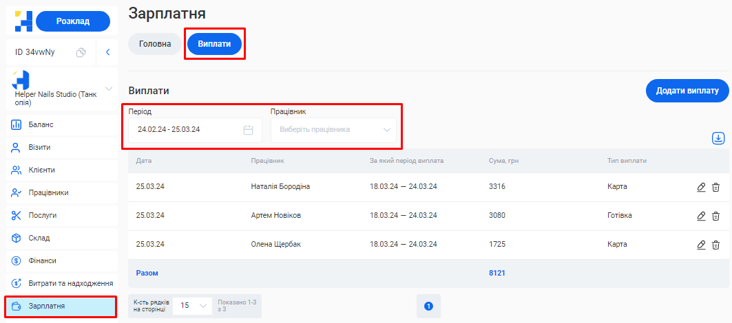 - Зарплатня. Сума нарахованої заробітної плати всіх співробітників.