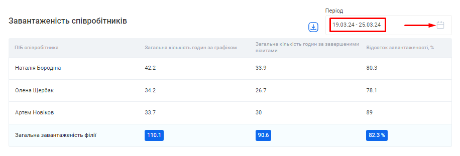 - Відсоток завантаженості. Тобто який відсоток робочих годин філії зайняли візити та надання послуг.