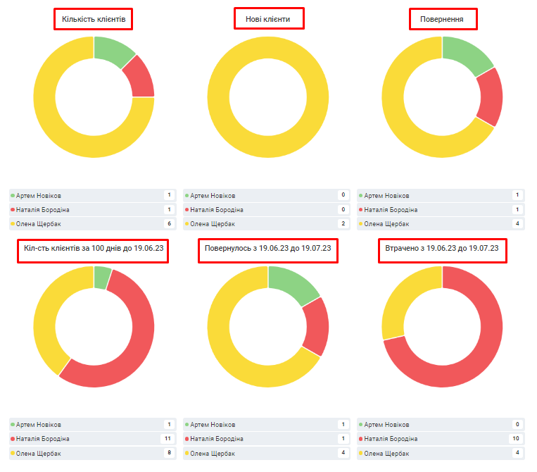 - Кількість нових клієнтів у числах і відсотках. Тут можна побачити точну кількість нових клієнтів, яких ви залучили за певний період, а також відсоткове співвідношення нових клієнтів до загальної кількості клієнтів.