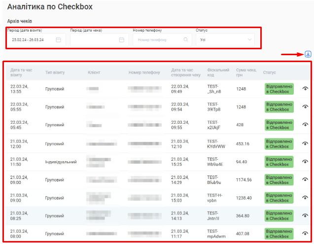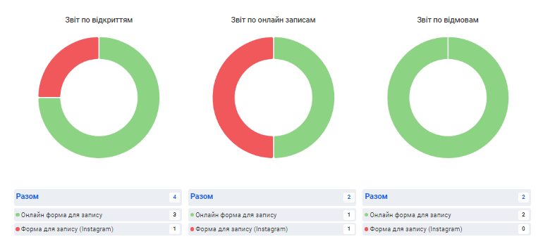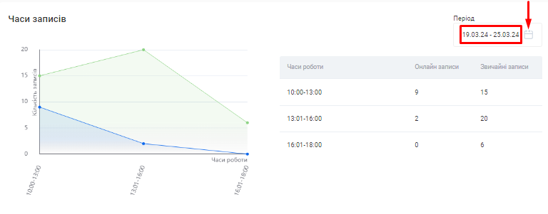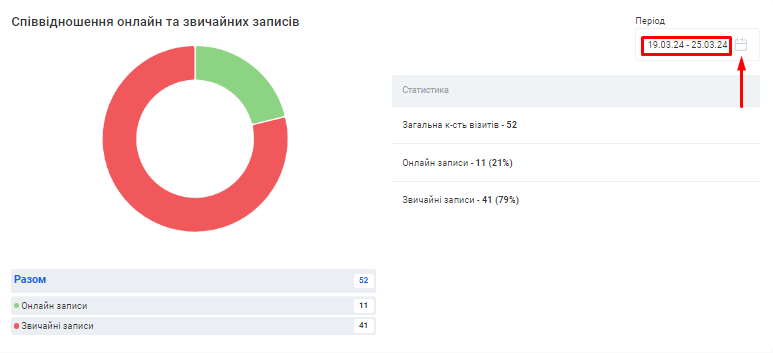 - Тут відображено зведену інформацію скільки і яких записів (ручних або онлайн) було здійснено у філії за обраний період.