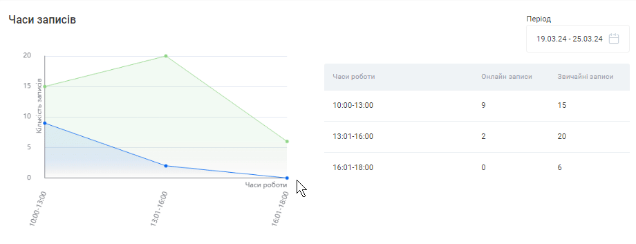 - Тут відображено кількість записів на послуги у різні години робочого дня.