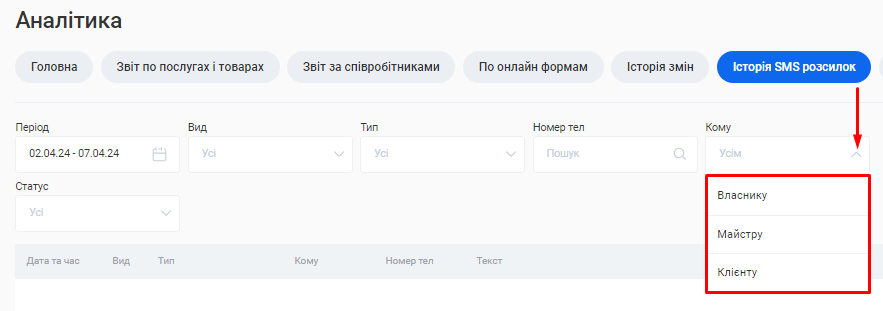 - Відфільтрувати розсилки за отримувачем. Для цього оберіть з переліку у полі «Кому» необхідний варіант: Усі, Власнику, Майстру або Клієнту.