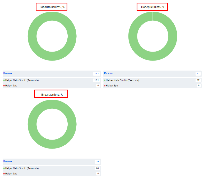 - До звіту включено три динамічні діаграми, що візуалізують інформацію по окремим стовпцям з таблиці: Завантаженість, Поверненність та Втрачаємість.