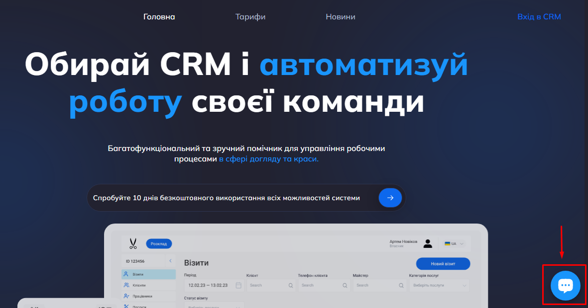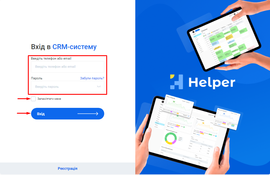 1. Натисніть кнопку «Вхід в CRM» у правому верхньому кутку сайту Helper CRM.