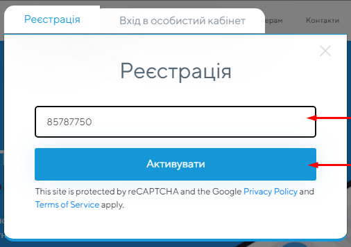 6. У наступному вікні введіть у відповідне поле цифровий код, який надійшов вам у SMS на номер, вказаний при реєстрації.