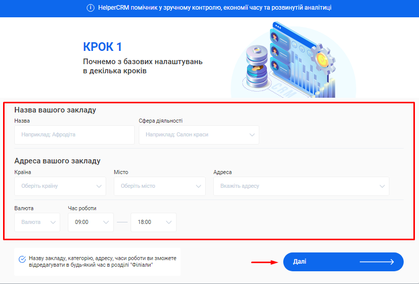- Для завершення початкових налаштувань та переходу в особистий кабінет натисніть кнопку «Далі».